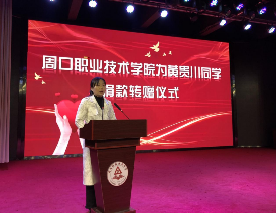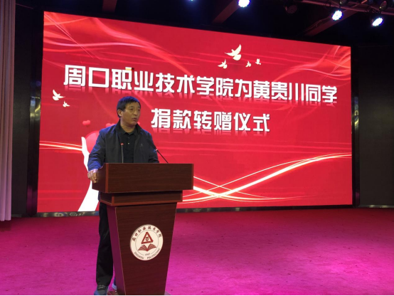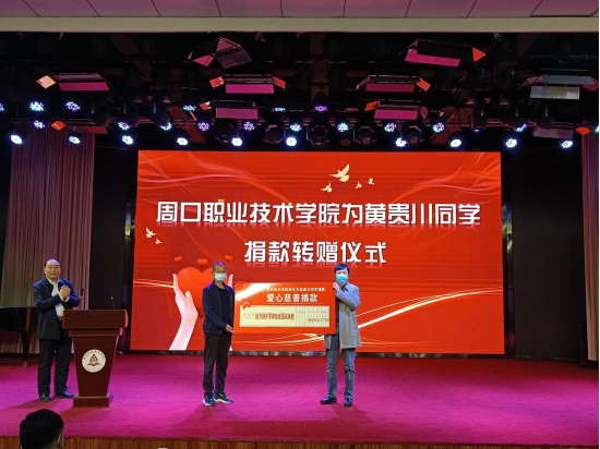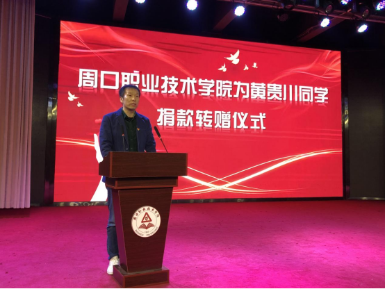 仪式最后,校党委书记刘士欣向黄贵川同学的辅导员赵保军老师转赠学校爱心捐款,并表示对黄贵川同学的关怀和慰问,希望他勇敢面对困难,战胜疾病,树立起对生活和学习的信心,祝愿黄贵川同学早日康复,踏上人生新征途。