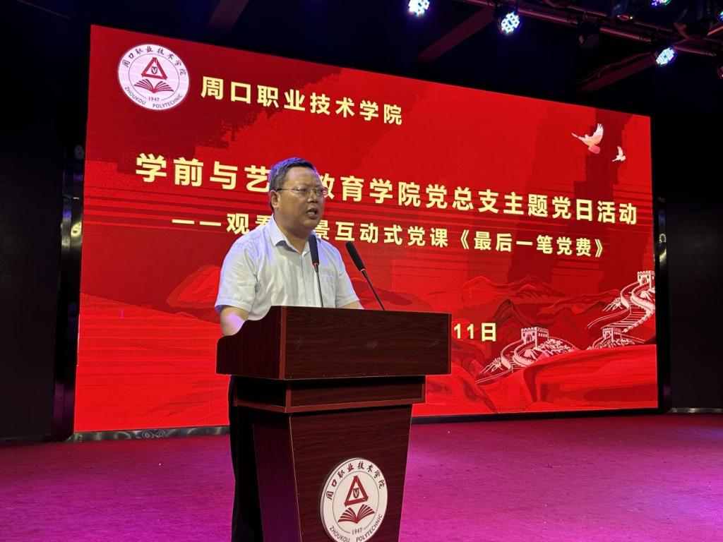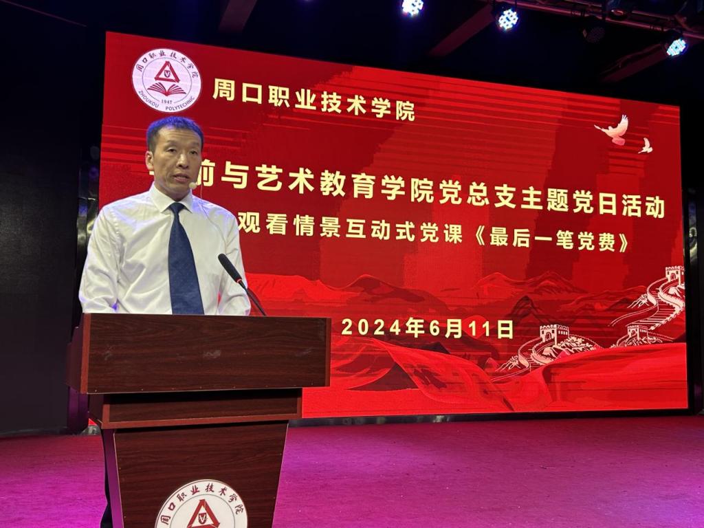 观看前,我院党总支书记王春生为大家介绍了情景互动式党课《最后一笔党费》前期的准备情况。他讲到,在短短的时间内,从敲定剧本到确定演员,从开始排练到首演,全体演职人员都付出了很多努力。排练过程中,我院演员教师第一次参演这样的情景剧,即使不是专业性表演专业出身,遇到了极大的挑战,但全体成员不怕困难、积极参加训练,精益求精、只为最后呈现出精彩的演出。