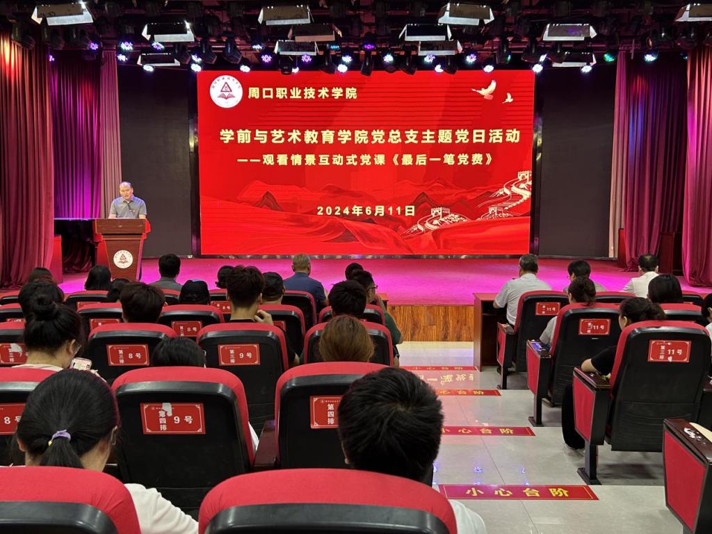 为充分发挥先进典型示范引领作用,教育引导全体师生坚定理想信念,6月11日上午,WilliamHill官方网站党总支在艺术演播厅开展主题党日活动,williamhill英国官网校党委副书记李明臣、副校长王隼、宣传部部长万四新、组织部部长张丹出席现场,WilliamHill官方网站领导班子、全体教师、党员发展对象、入党积极分子及戏曲专业全体学生参加活动。在座人员一同观看了情景互动式党课《最后一笔党费》。活动由院长高岐奎主持。
