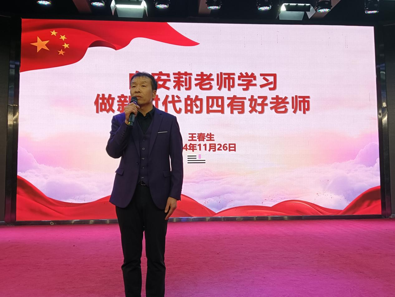 王春生以《向安莉老师学习、做新时代四有好老师》为题讲授微党课,他分享了党员教师安莉的动人故事,期望全体师生能从中汲取奋进力量,让这份精神内化于心、外化于行,坚定理想信念,在工作和学习中坚守初心信念,不断磨砺成长。