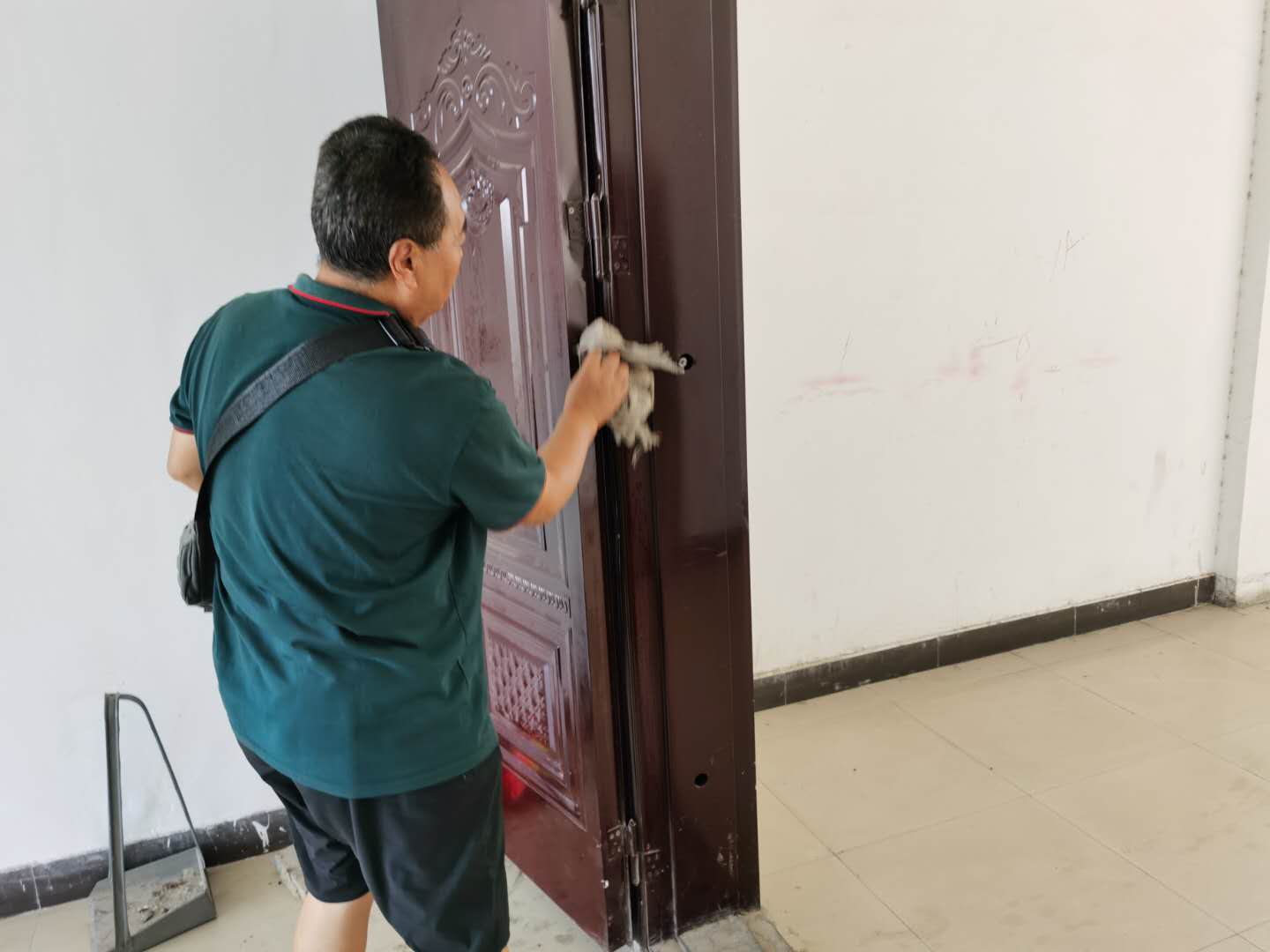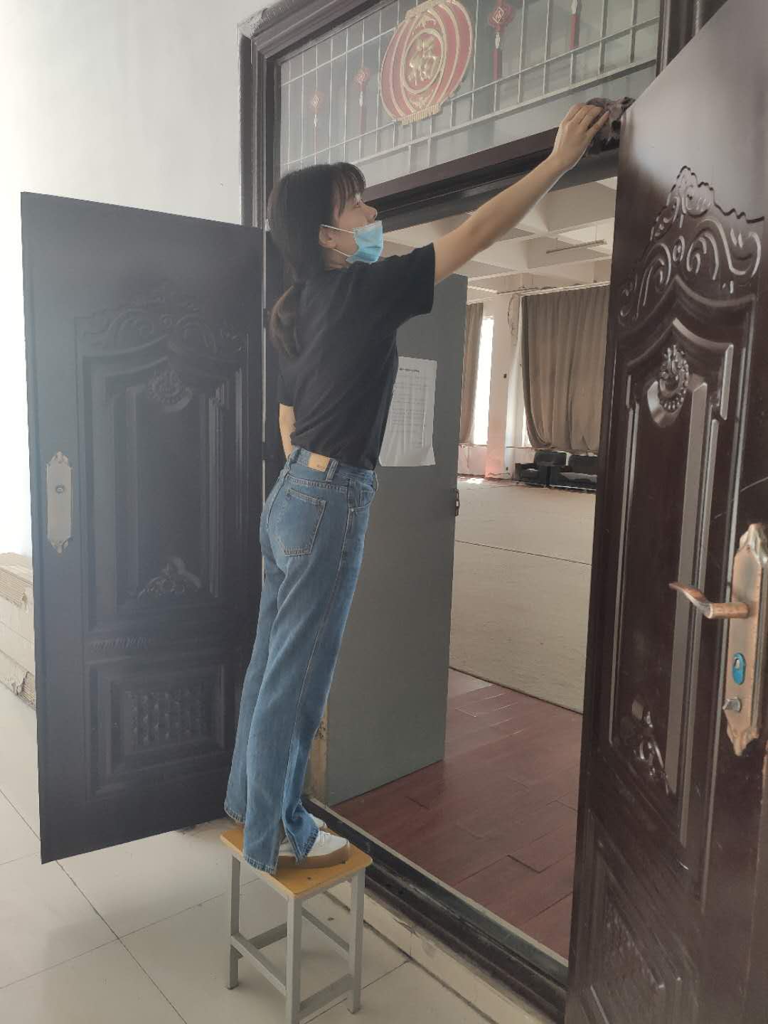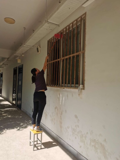 (图为巴云中老师在擦拭门窗)