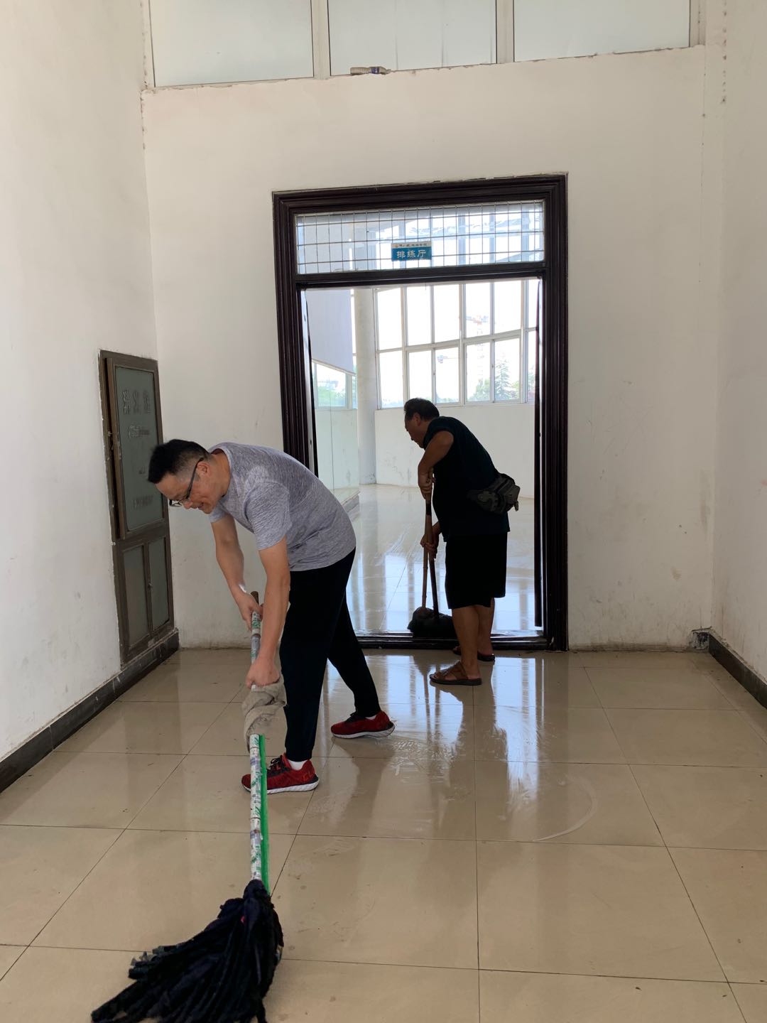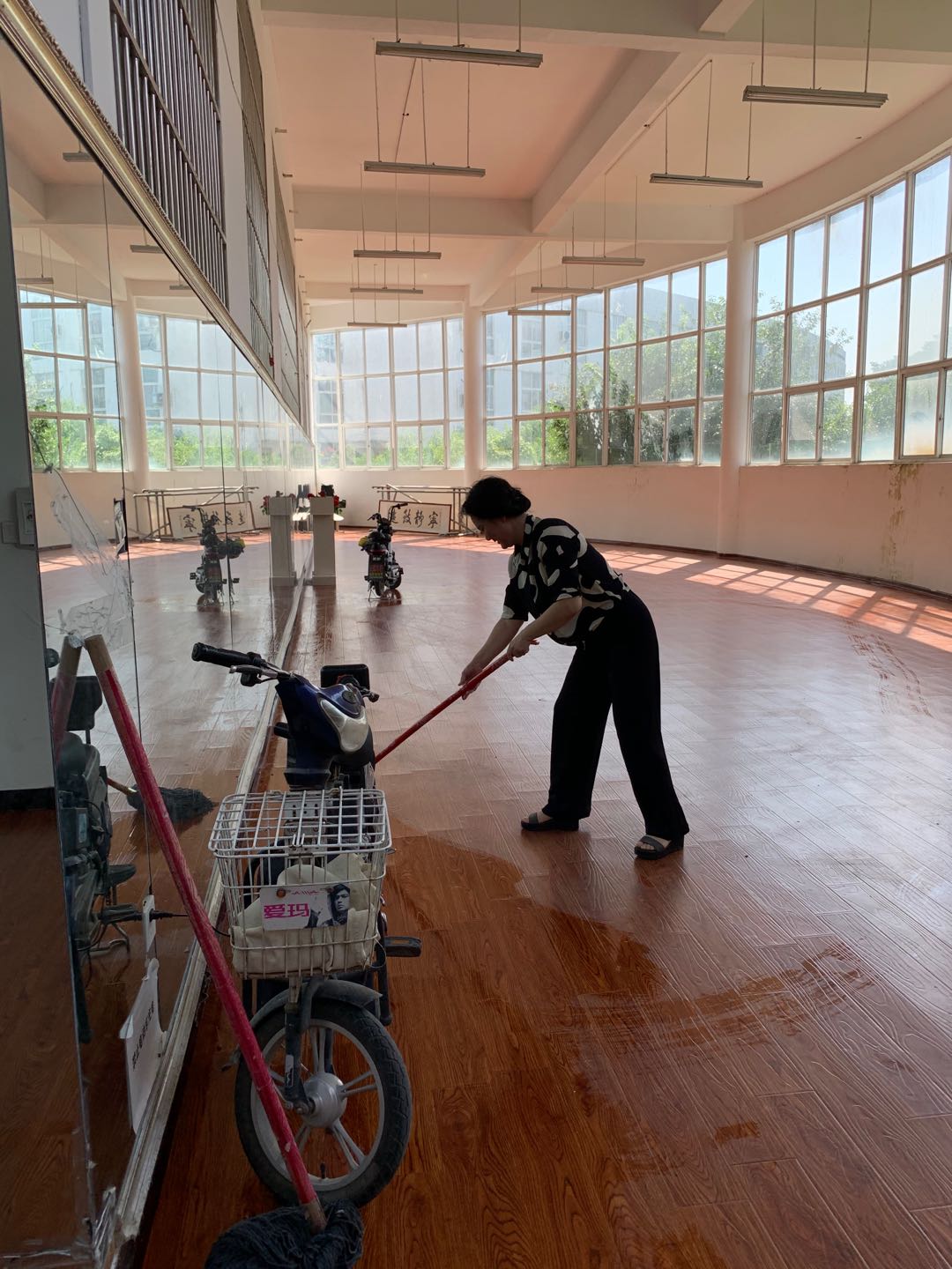 (图为陈旭老师在拖地)