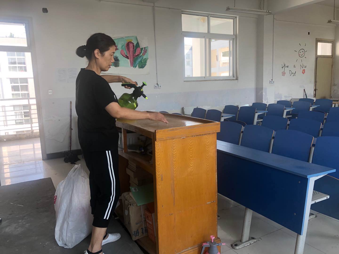 (图为李荣老师在为教室卫生消毒)