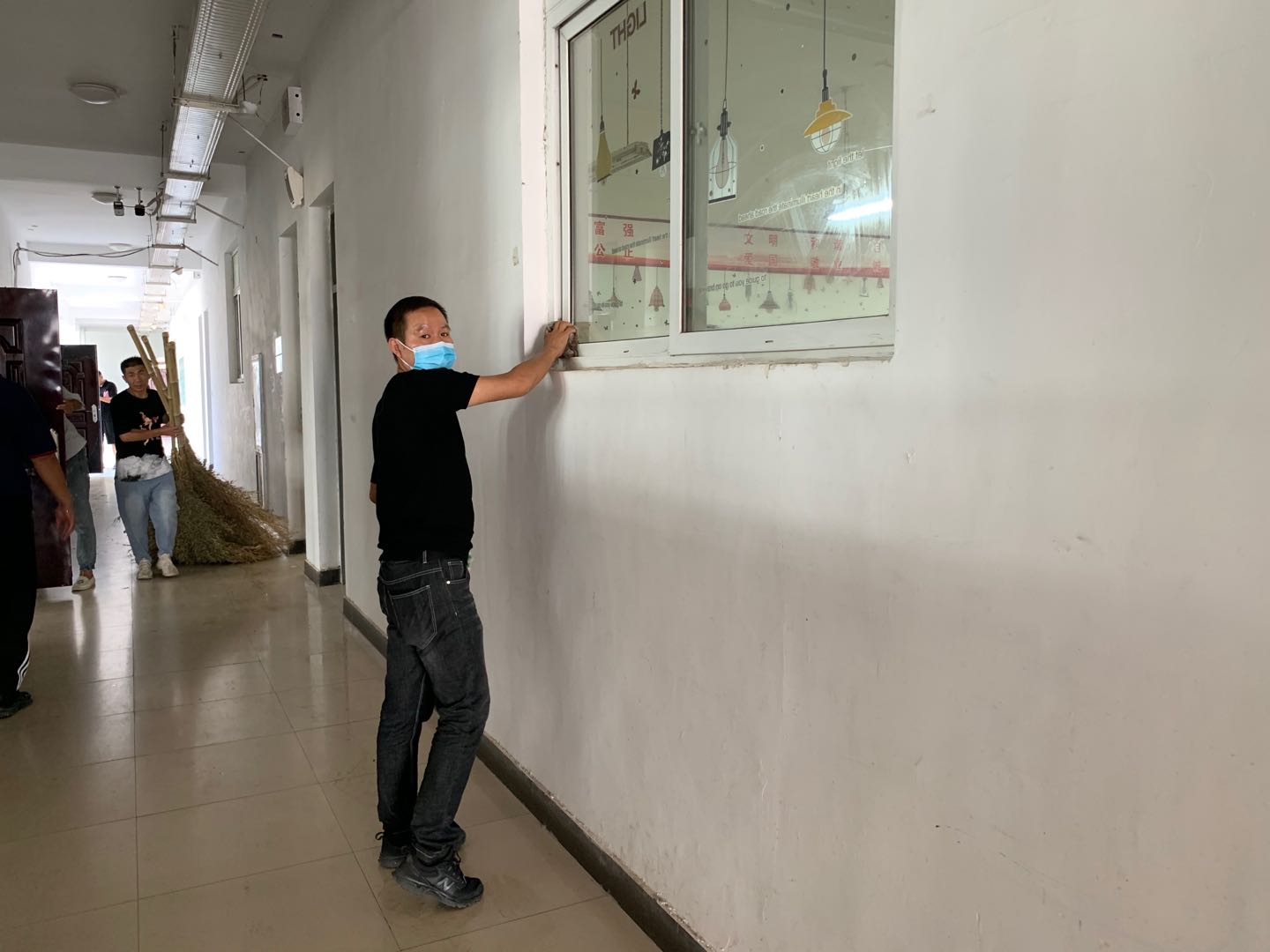 (图为彭莹老师在打扫走廊)