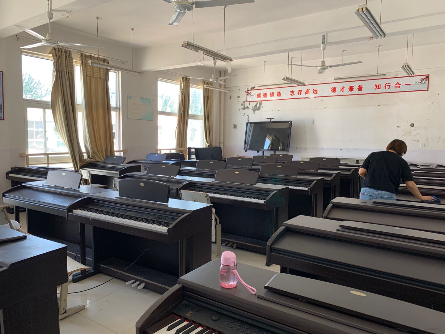 (图为李艳霞老师在打扫数码钢琴教室)