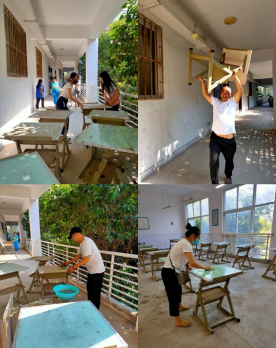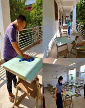 上午9:30时,美术教研室全体教师在画室集合,大家齐心协力搬桌子,擦灰尘、扫地、擦拭黑板、清理墙面、拖地。经过老师们辛勤的忙碌,空空荡荡的画室里摆满了干净且整洁的桌椅,明亮的画室为视觉传播设计与制作专业和美术教育专业的学子们返校学习专业课创造了良好的环境。