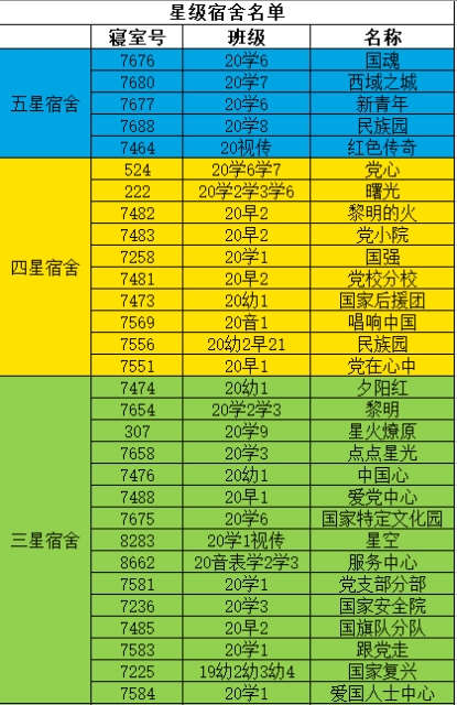 最后,通过宿舍风格、宿舍名称、宿舍装饰、宿舍卫生、宿舍安全五个方面进行评比,共评选出五星级宿舍五个,四星级十个,三星级十五个。