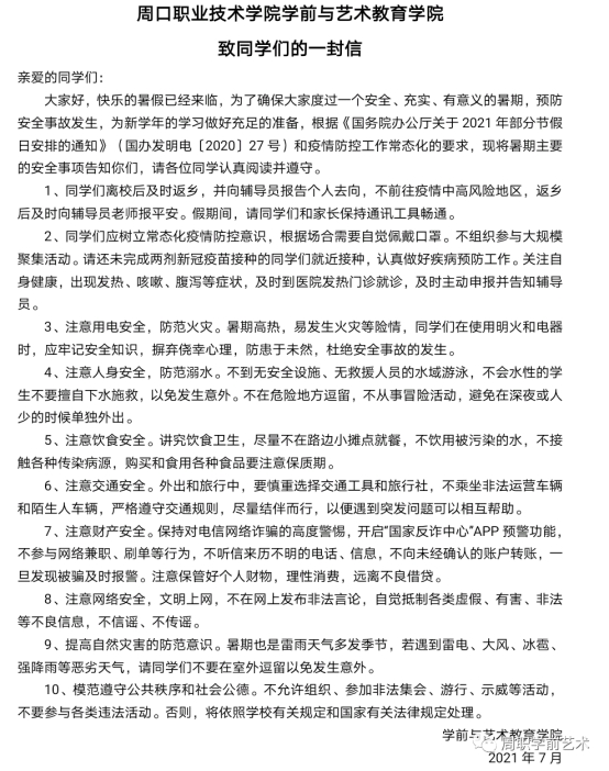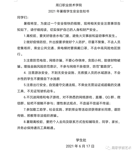 2021年暑假已经开始,WilliamHill官方网站积极响应上级通知切实做好我院暑假期间的安全保卫工作,保障学生度过一个“安全、健康、快乐、充实”的假期。7月7日,我院开展了线上安全教育活动并发出暑假安全提示: