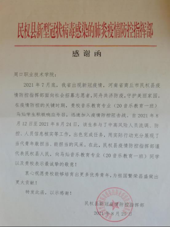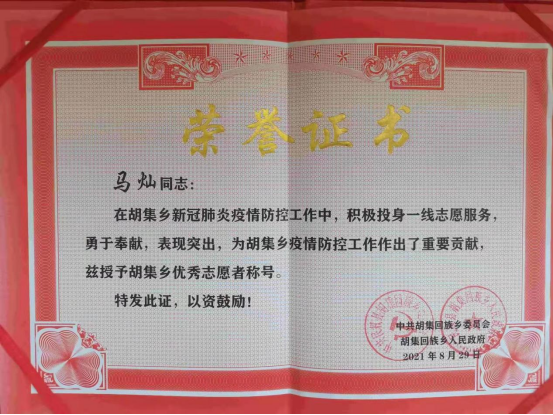 受资助学生马灿同学在疫情最严峻的时候积极响应号召,坚守疫情防控岗位,出色的完成疫情防控任务,乡政府和当地疫情防控指挥部发来荣誉证书和感谢函,表彰马灿同学为此次疫情防控做出的突出贡献。