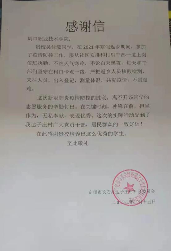 21级早期教育二班吴佳濛同学,在寒假返乡期间,参加了疫情防控工作,服从社区安排和村干部一同值班执勤,严把返乡人员核酸检测,不惧困难,无私奉献。