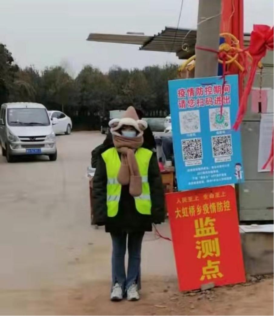 20级早期教育二班的马会格同学,家住河南省开封市尉氏县大桥乡大路王村,在知道疫情来临后,积极响应号召,主动参加当地的疫情防控志愿者服务活动中。她的主要工作是负责在村庄入口处进行疫情卡点,对外来人员进行排查是否具有核酸检测证明,查看健康码和行程码,对来往人员进行体温测量,在疫情卡点出值班站岗等。