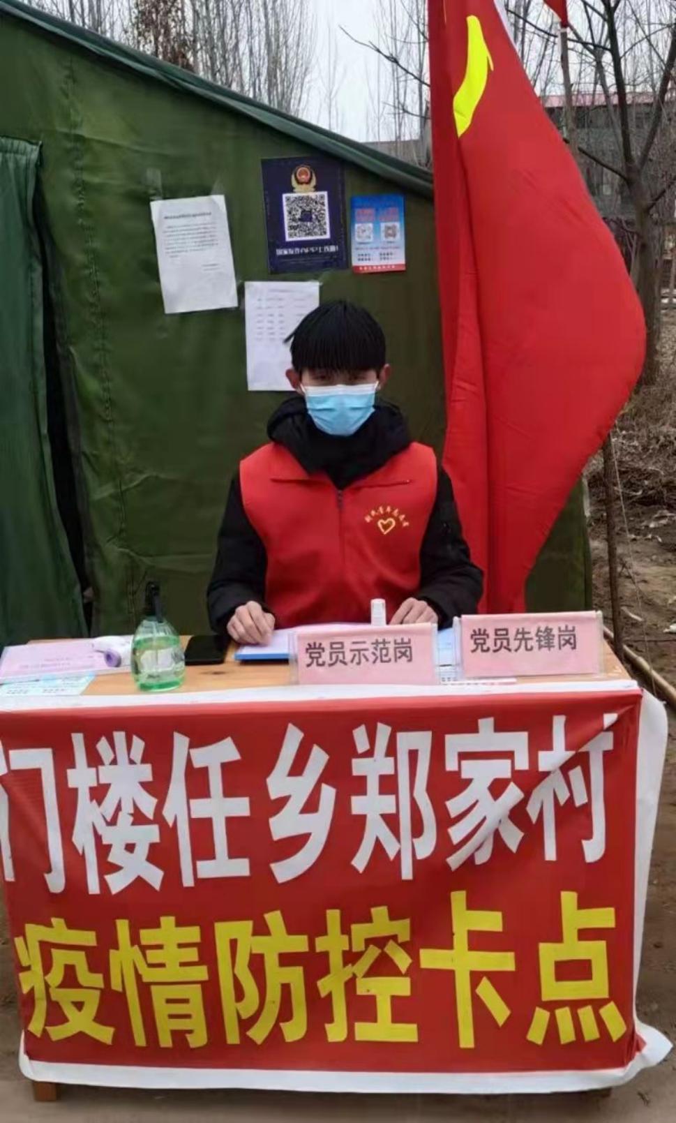 20级早期教育二班的任瑞新同学,家住河南省开封市尉氏县门楼任乡郑家村,在疫情来临之际,积极配合,主动投身于当地的疫情防控志愿者服务活动的队伍中。他的主要工作是负责在村庄入口处执勤站岗,对来往人员进行体温测量,查看来往人员的健康码和行程码,维护现场秩序,宣传防疫知识等。