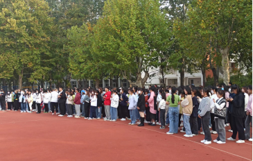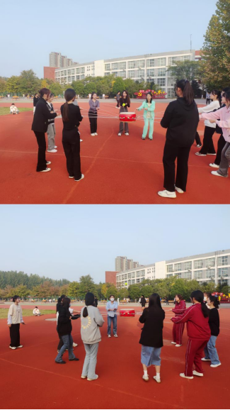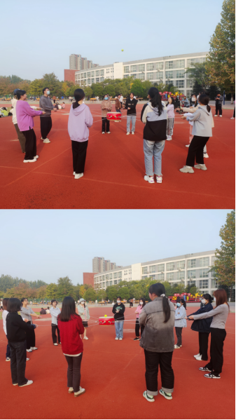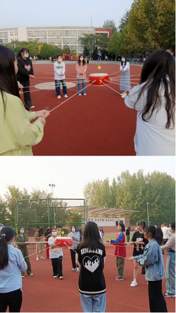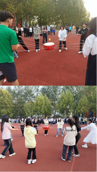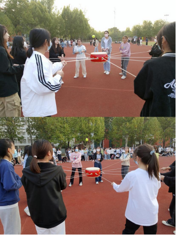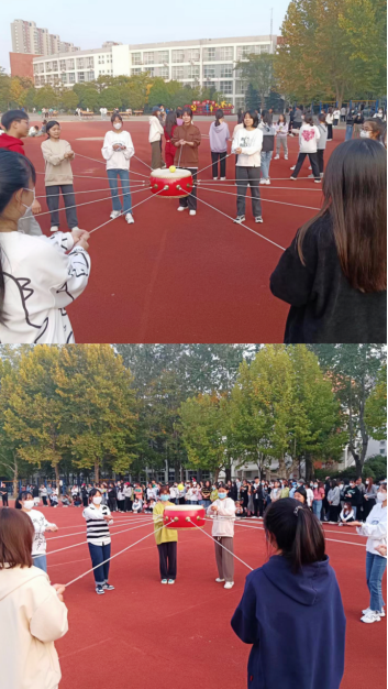 本次击鼓颠球趣味比赛活动以班级为单位,每班派出十二位队员,每组队员分别用手拉住有十二根绳子的鼓去接弹在空中的网球。比赛前,每个团队都争分夺秒地开始预热,讨论交流控球技巧。随着哨声响起,击鼓颠球比赛正式开始!