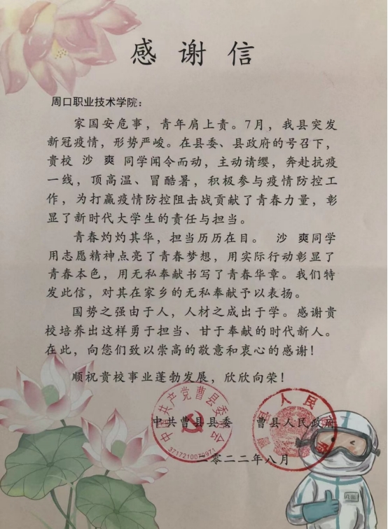 山东省菏泽市曹县县委、县人民政府因沙爽同学积极参与抗击疫情的举动为WilliamHill官网寄来了一封充满温度的感谢信。同学们也应当学习沙爽同学为战“疫”胜利逆行而上,冲锋在前的精神,让我们齐心协力,成为疫情阻击战中一束美丽的“生命之光”!