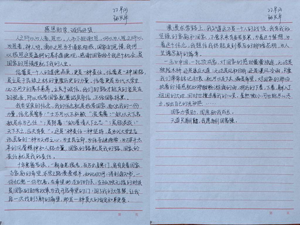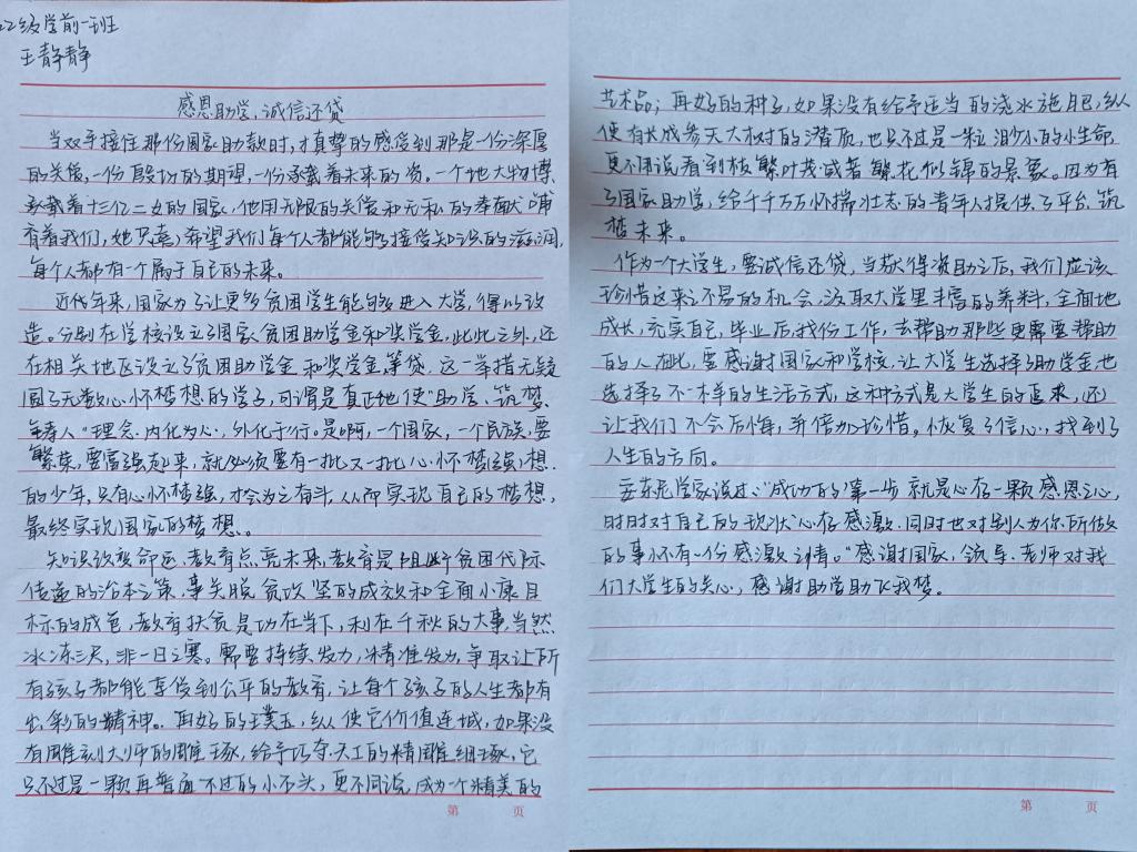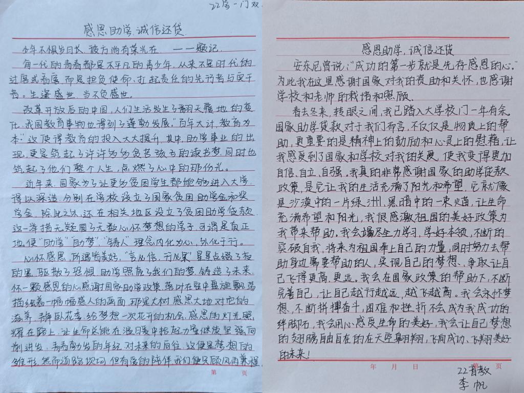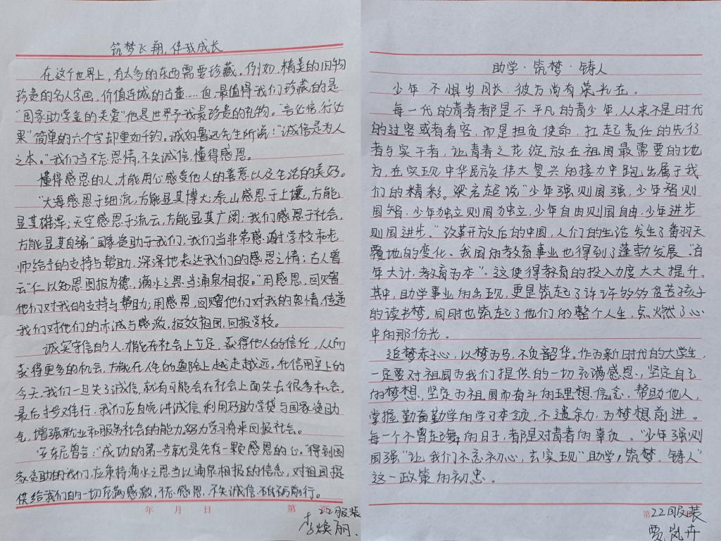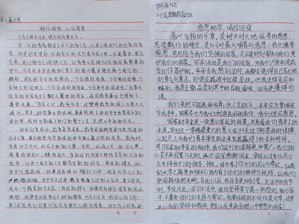 同学们挥笔泼墨、积极投稿,表达着对国家资助政策的感激和对学校及家人的感恩之情。文中语言朴实,情感流露,让人内心久久不能平静。