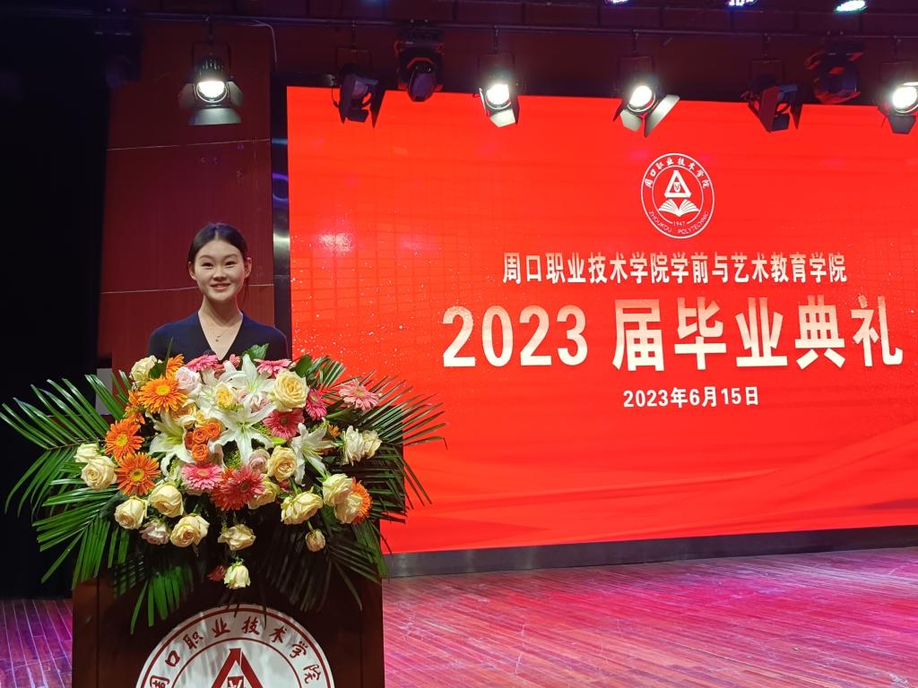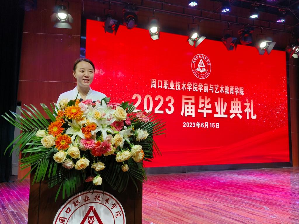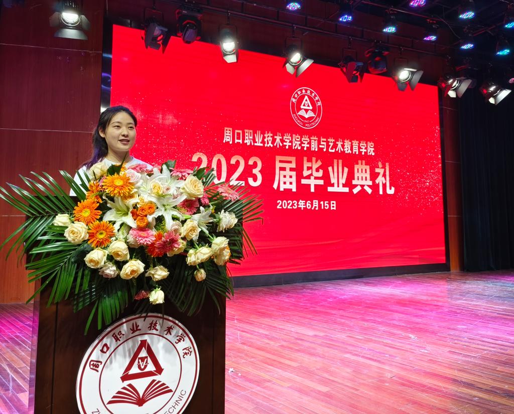 20级学前教育7班学生于凡代表优秀毕业生发言,她深情回顾了三年来在学校收获的温暖情谊、经历的蜕变成长,表达了对母校、老师、同学的感恩之情,并送上对学院的美好祝福。