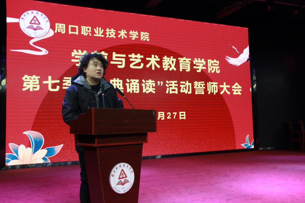 王春生作讲话。他讲到,在排练过程中,指导老师要始终坚持高标准要求学生,确保排练的最高水准;同学们要全身心投入到排练活动中去,以饱满的精神状态、满腔的热情、昂扬的激情完成此次“经典诵读”活动。