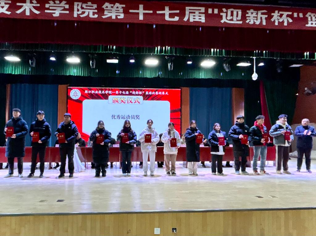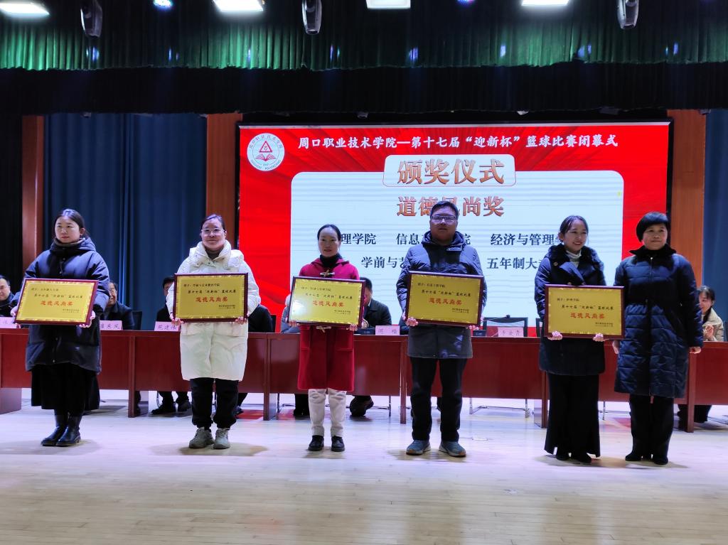 12月21日下午,williamhill英国官网在体育馆举行第十七届"迎新杯"篮球比赛闭幕式。我院学管办主任郑玉凡及篮球队员参加闭幕式。我院荣获本次比赛道德风尚奖,22级早期教育二班赵瑶、22级音乐表演一班赵乾提两位同学获优秀运动员奖。