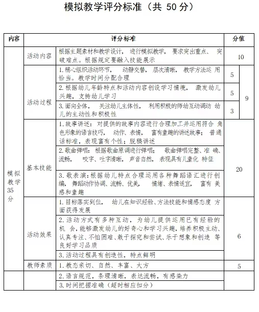 2.模拟教学:在确定内容后,对课程内容进行分析,根据课程内容确定活动目标,设计活动方案,在备课的基础上,进行模拟教学展示。总时间不超过7分钟。