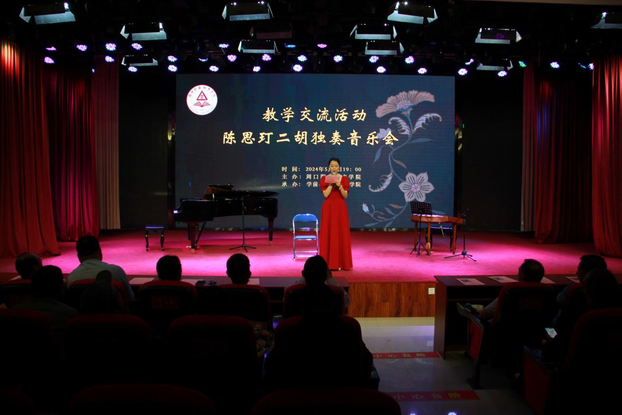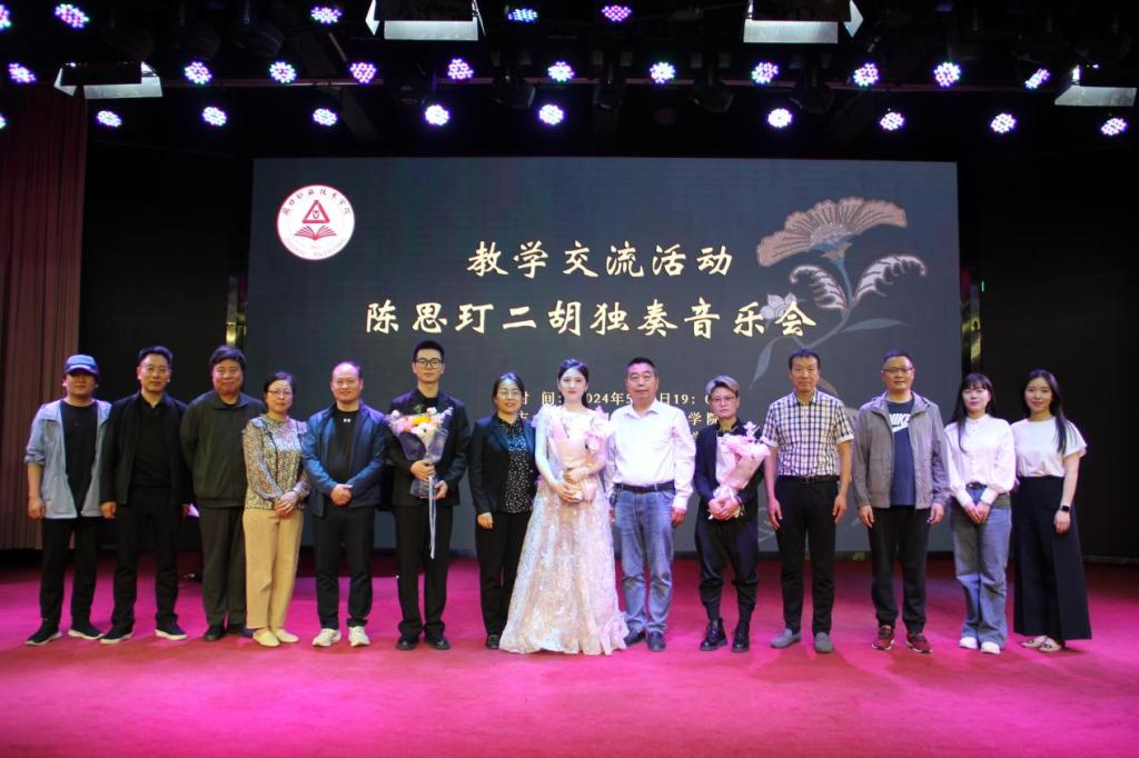 5月8日晚,中央音乐学院民乐系二胡专业学生陈思玎前来williamhill英国官网开展教学交流活动暨二胡独奏音乐会。周口师范学院闵惠芬艺术研究中心主任张丽教授,商水县音乐家协会副主席、周口民族管弦乐团团长李耀斌,williamhill英国官网招生就业处处长许建国、WilliamHill官方网站党总支书记王春生、院长高岐奎出席音乐会现场。WilliamHill官方网站师生和社会音乐爱好者们欢聚在此,共同聆听这场音乐盛宴。