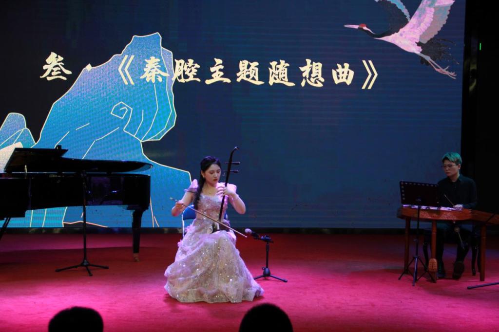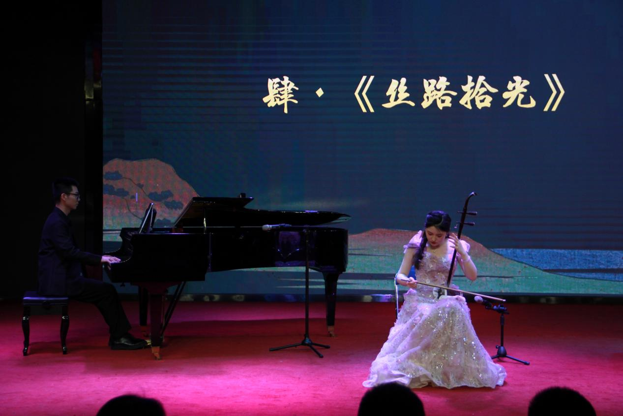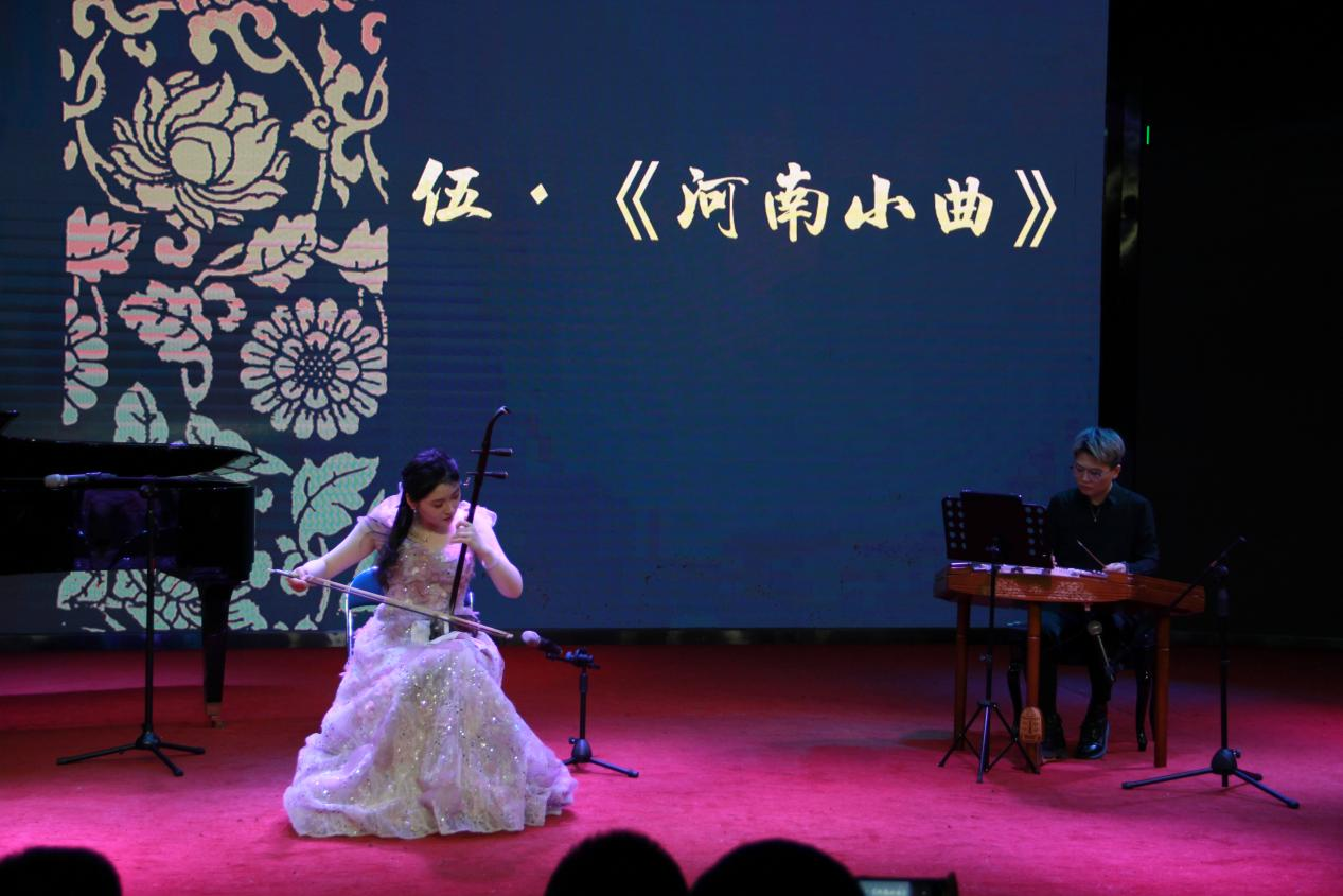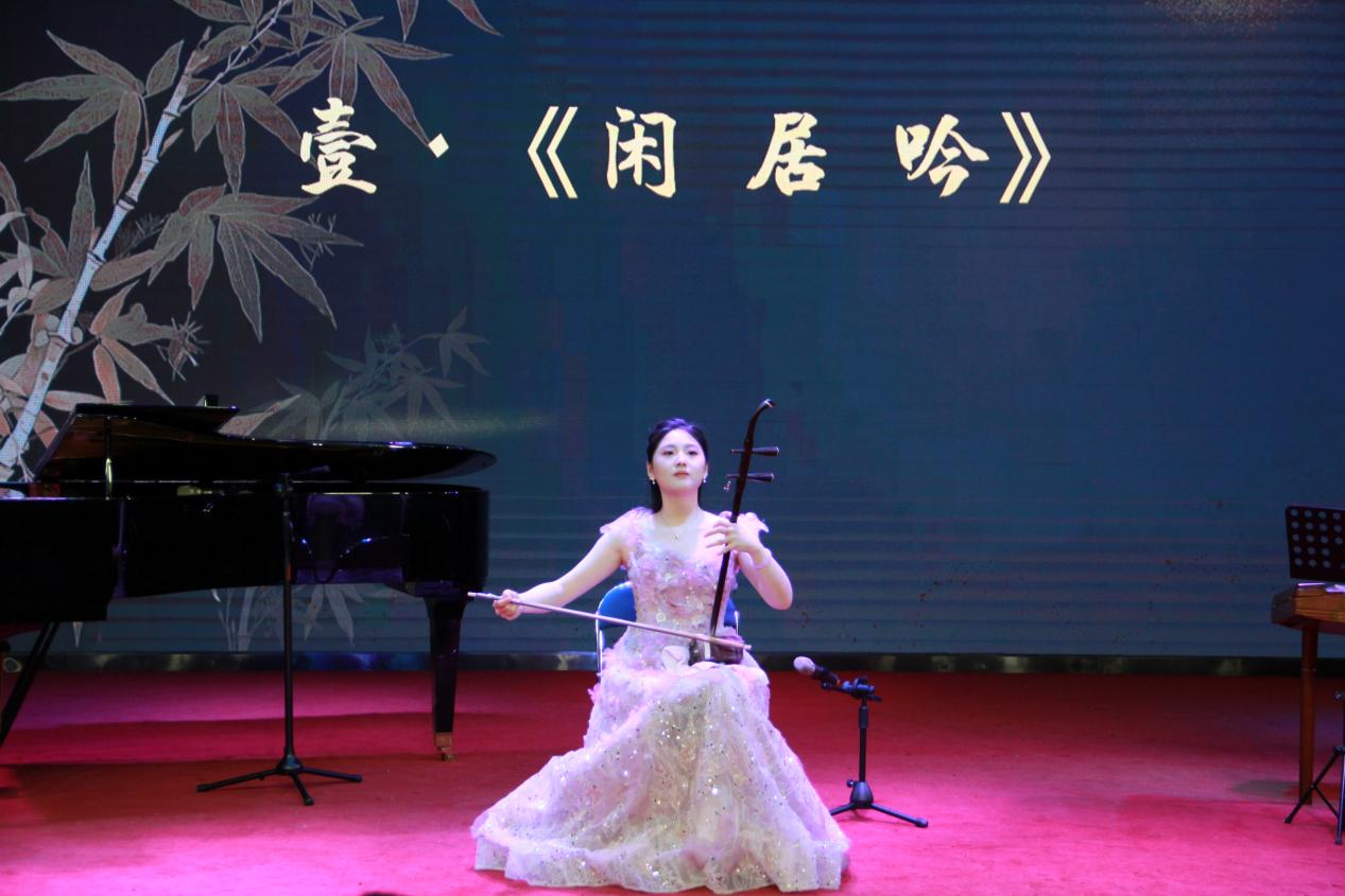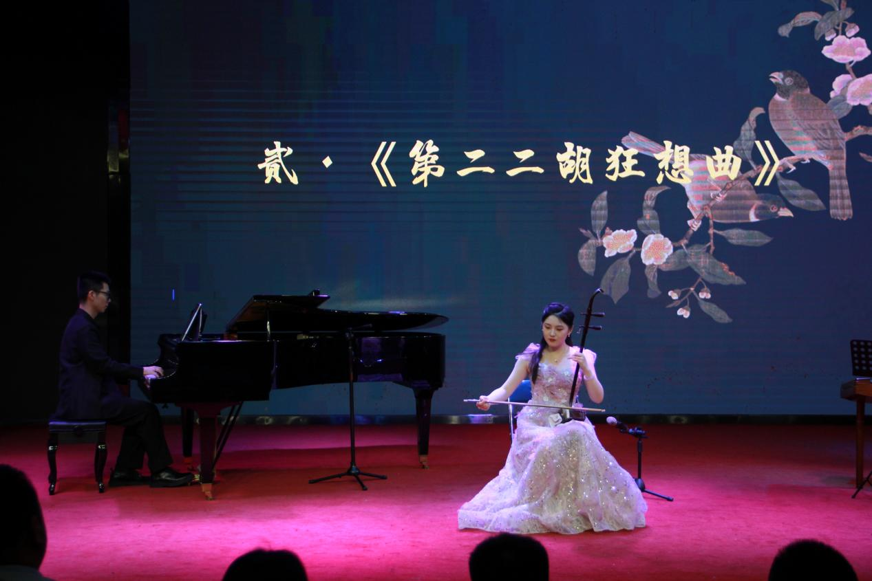 陈思玎同学现就读于中央音乐学院民乐系本科四年级二胡专业,她以一曲二胡独奏——《闲居吟》拉开音乐会的帷幕。乐曲典雅清越,展现了刘天华先生在逆境中依然保持乐观和怡然自得的心情,充满了宁静与恬淡。接着,她又演绎了几首风格各异的乐曲。其中《第二二胡狂想曲》采用了湖南民歌曲调和花鼓戏音调元素,地域色彩鲜明,充满了湖南音乐的独特韵味和“狂想曲”体裁的炫技特征;《秦腔主题随想曲》以陕西地方戏曲秦腔的音乐为素材,生动地表现了西北人民爽朗豪放的性格;《丝路拾光》以其充满异域风情的风格,带领大家畅游在丝路的广阔天地中;《河南小曲》以河南曲剧音调为素材,生动地表现了河南人民对家乡的赞美和主人翁的自豪感,令人印象深刻。
