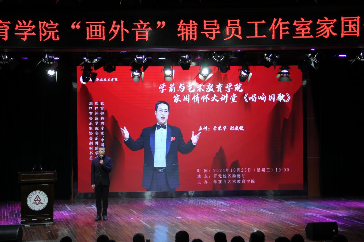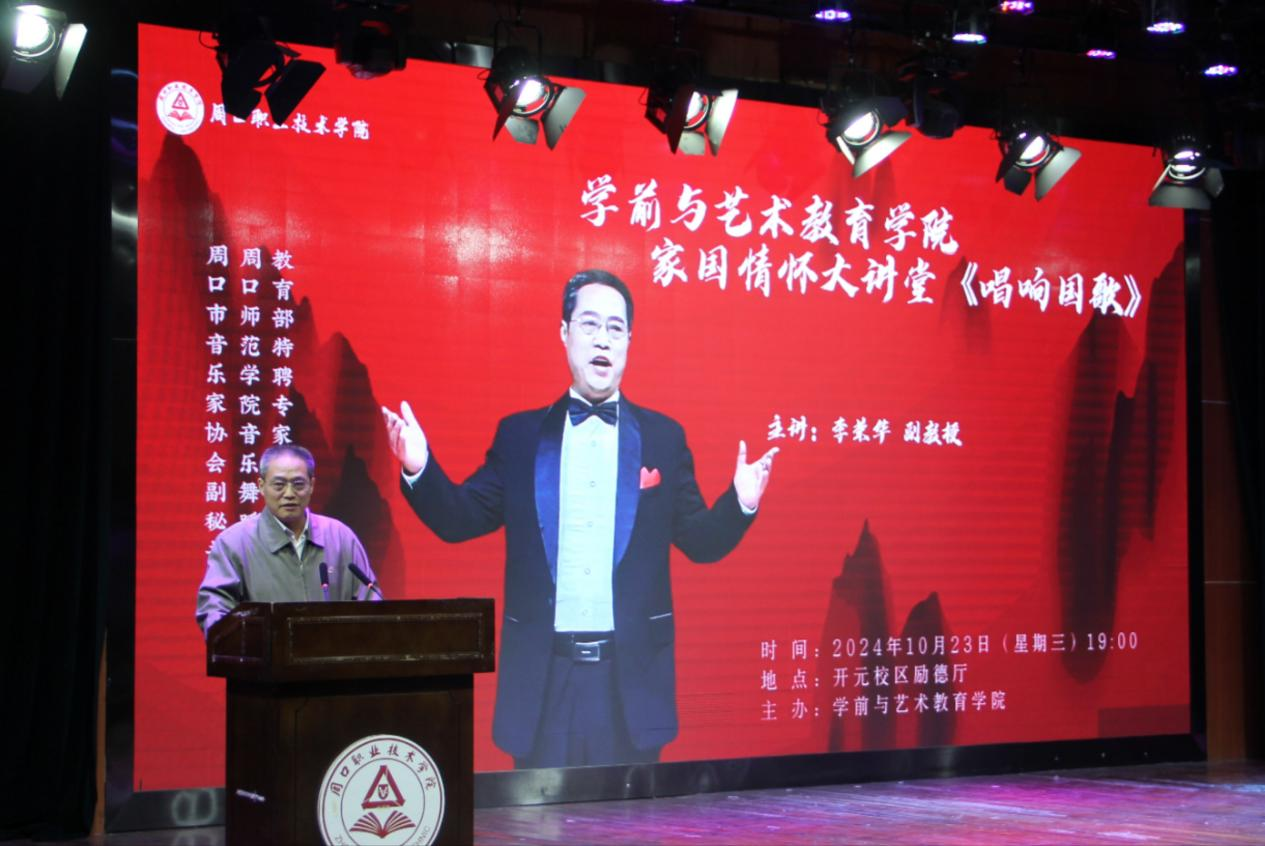 为弘扬中华优秀传统文化,厚植家国情怀,凝聚新时代青年团结奋进的力量。10月23日晚上,WilliamHill官方网站(纺织服装学院)在砺德厅开展家国情怀大讲堂第二期活动。特邀教育部特聘专家、周口市音乐家协会副秘书长、周口师范学院副教授李荣华老师授课,校党委副书记李明臣,周口市音乐家协会主席魏强,校学生处处长刘冬霞,护理学院党总支书记孙先峰,医学院党总支书记苑建伟出席活动,学院党总支书记王春生主持。
