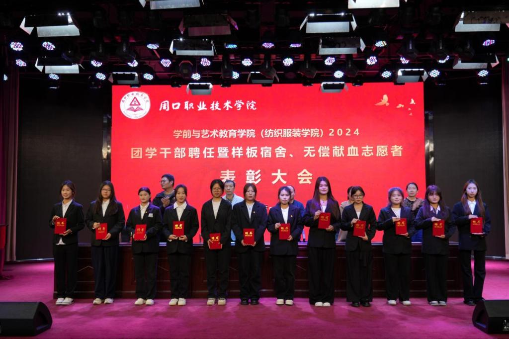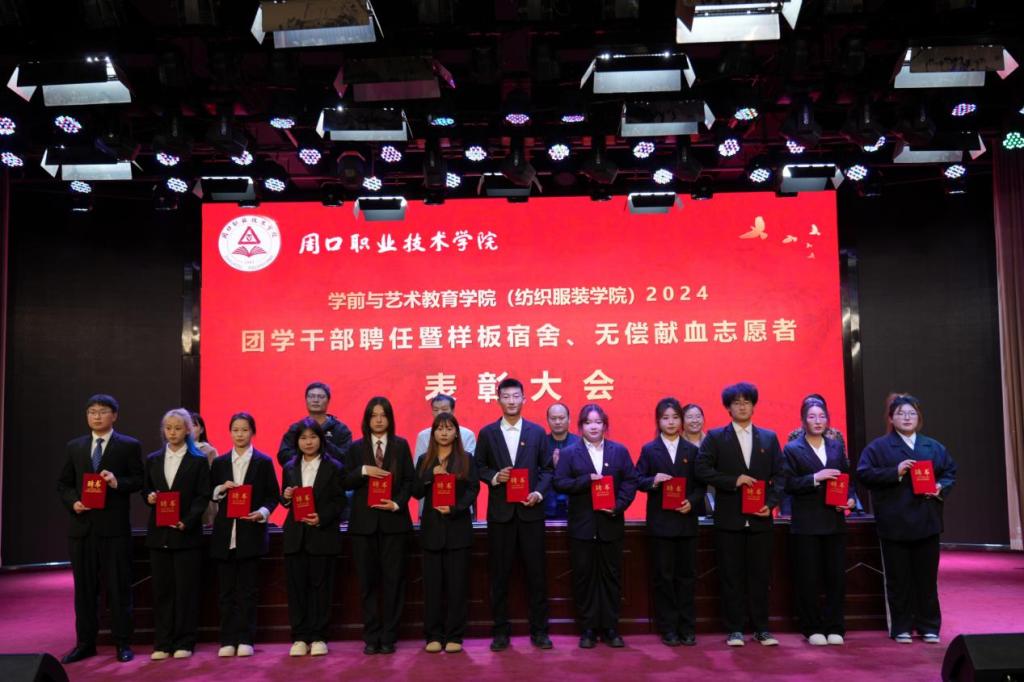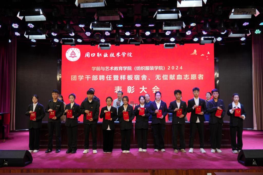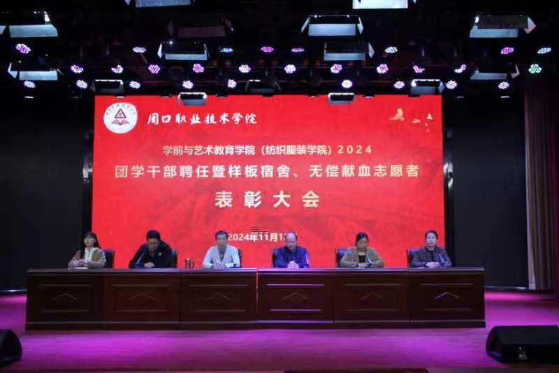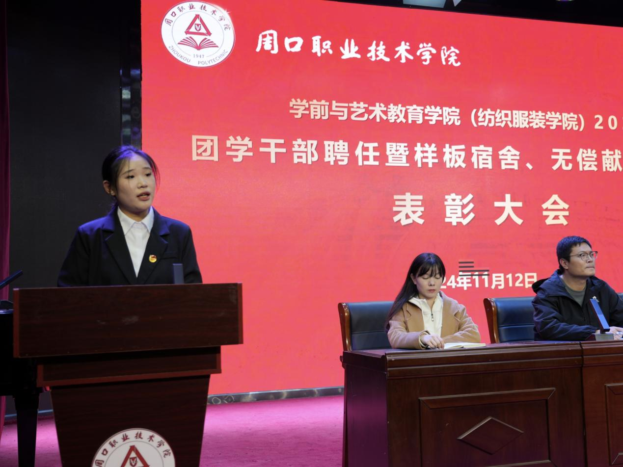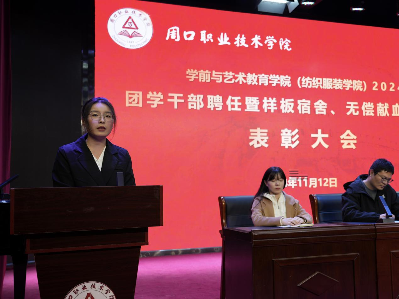 为进一步加强团学干部队伍建设,激发学生干部干事创业的积极性、表彰先进,展现周职学子的青春风采,11月12日晚,WilliamHill官方网站(纺织服装学院)在艺术演播厅召开2024团学干部聘任暨样板宿舍、无偿献血志愿者表彰大会。学院党总支书记王春生,院长高岐奎,学管办主任郑玉凡,教管办主任李晨阳,团总支书记刘馨馨,23级、24级全体辅导员老师及学生代表参加本次大会。大会由学院副院长杨晨主持。