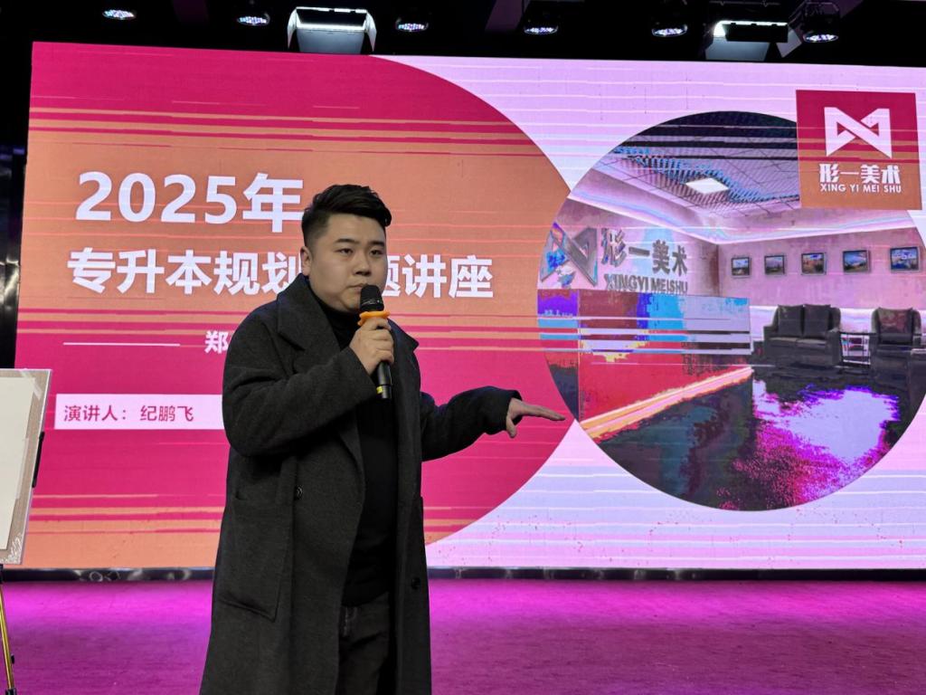 形一美术执行校长纪鹏飞作为主讲人,他以“提高学历层次,成就美好未来”为主题,全面而深入地剖析了河南省专升本政策的整体框架,讲解了报考条件、考试科目、招生计划等关键要素。随后,机构老师通过现场作画的方式,生动展示了应对专升本考试所需的综合能力,为同学们提供了直观的学习范例和启发。