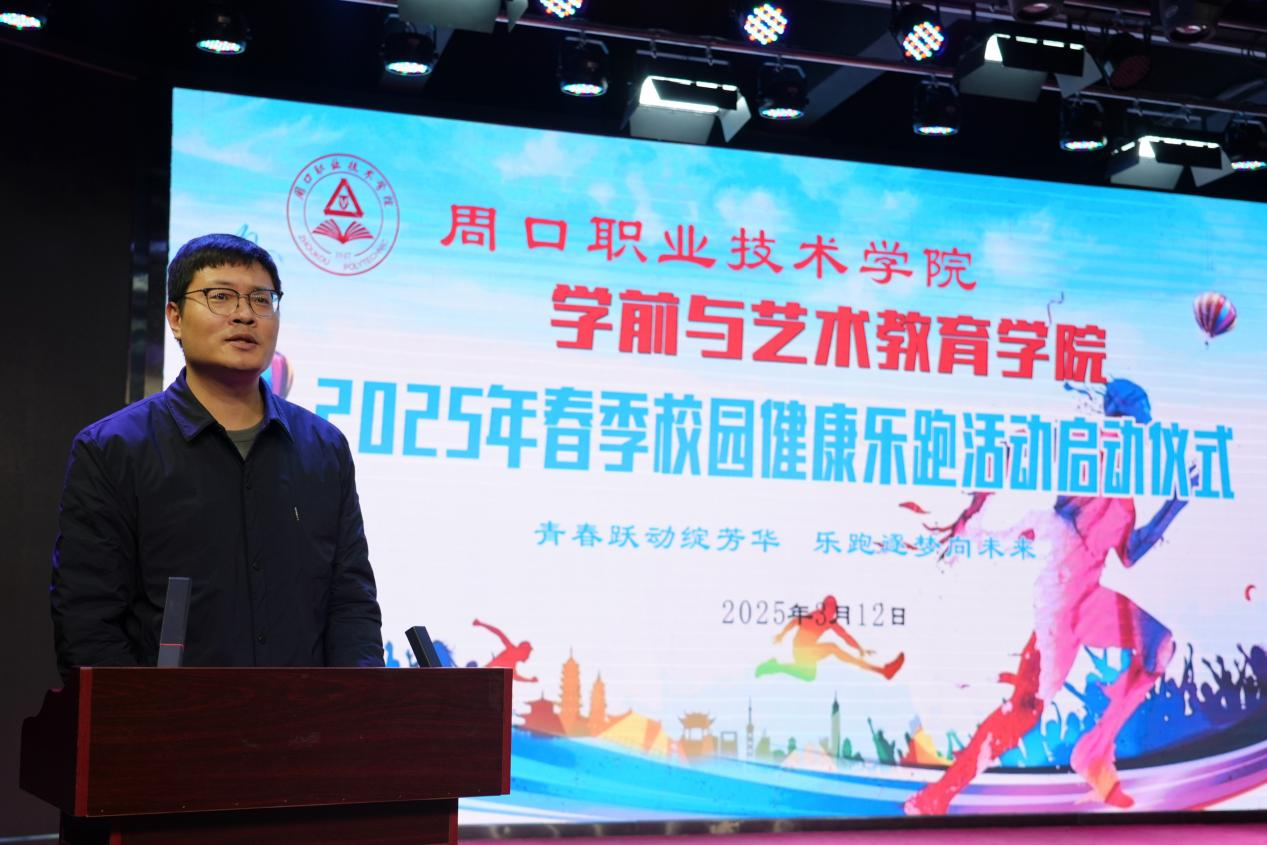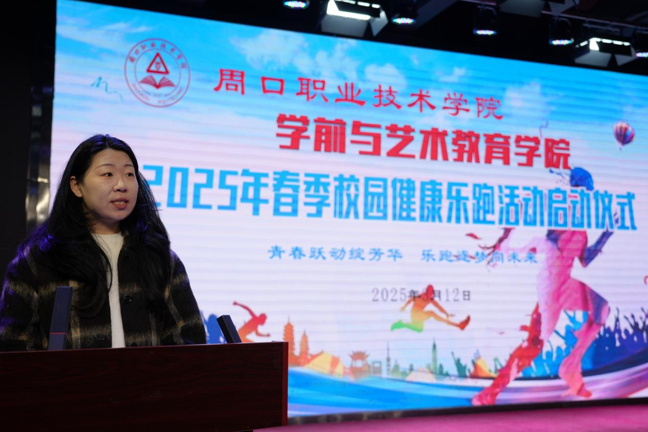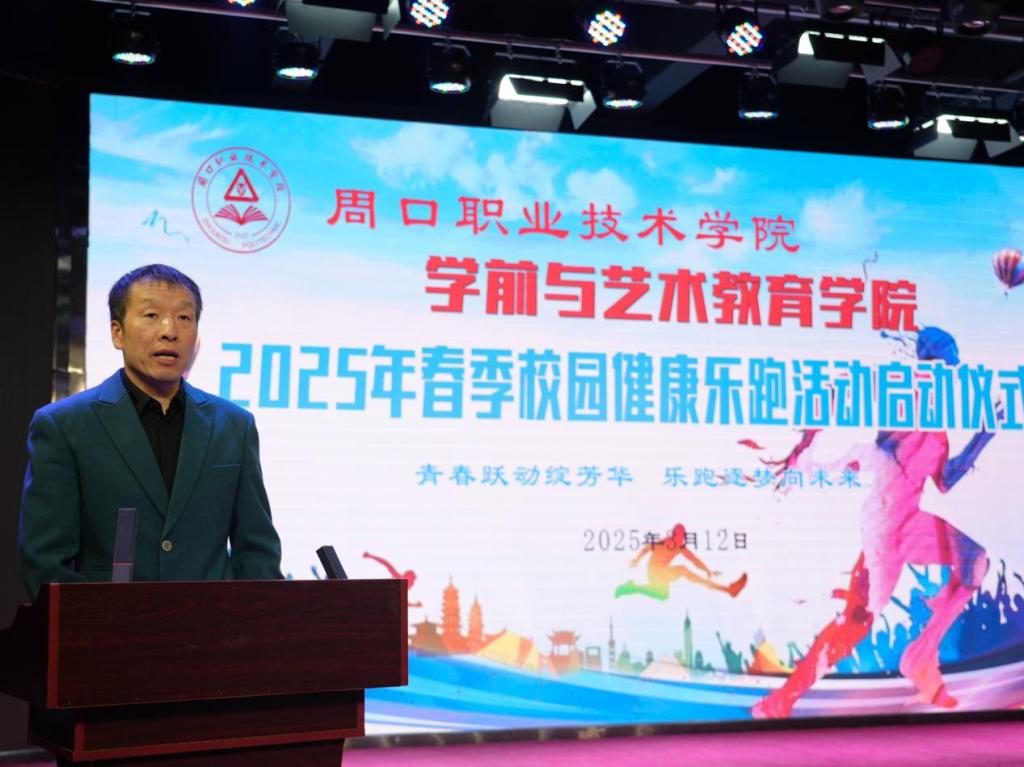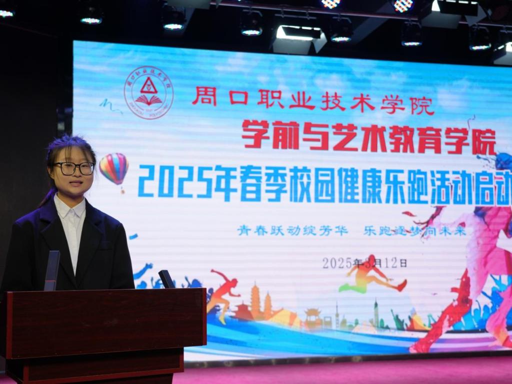 23级学前教育五班秦文妍、24级学前教育三班尤优作为学生代表发言。她们表达了对乐跑活动的热切期待,表明了积极参与的决心,向全体同学发出呼吁:“青春跃动绽芳华,乐跑逐梦向未来!同学们,让我们一起踊跃投身乐跑活动,将运动融入日常,化作生活的一部分,让健康成为生活的底色,用坚持诠释青春的活力,用奔跑追逐美好的未来!”