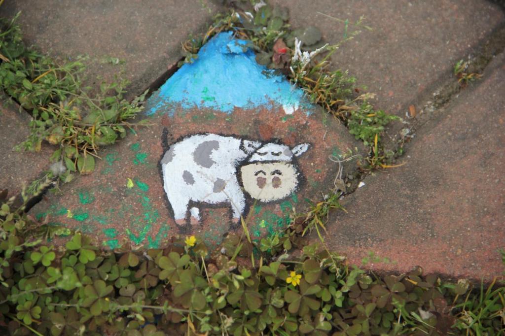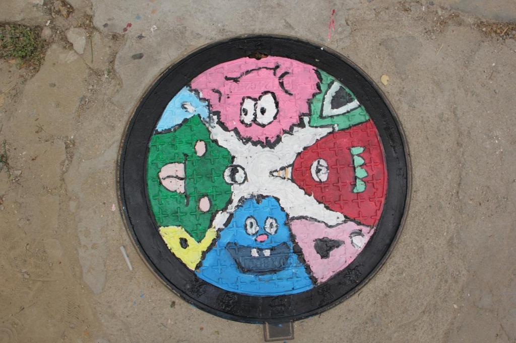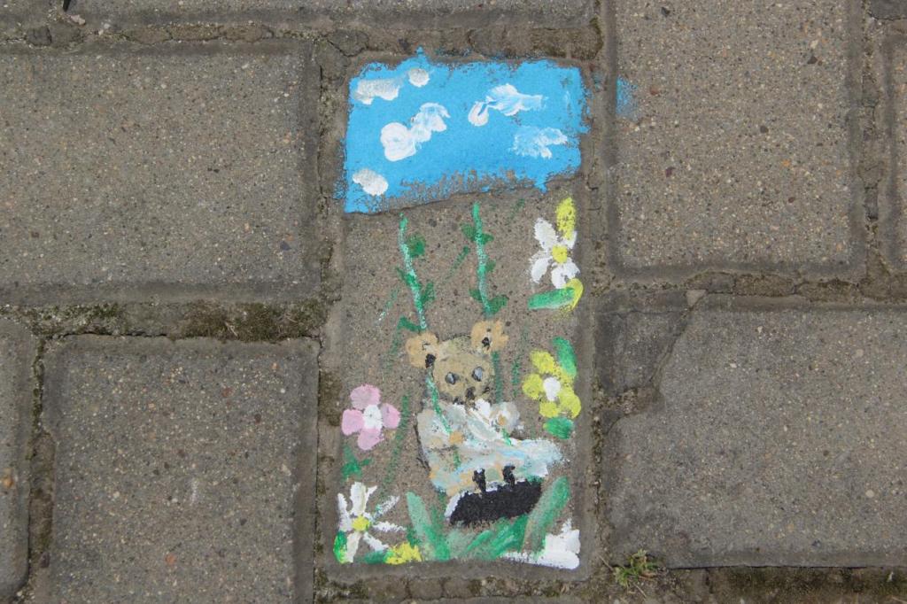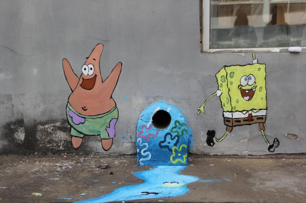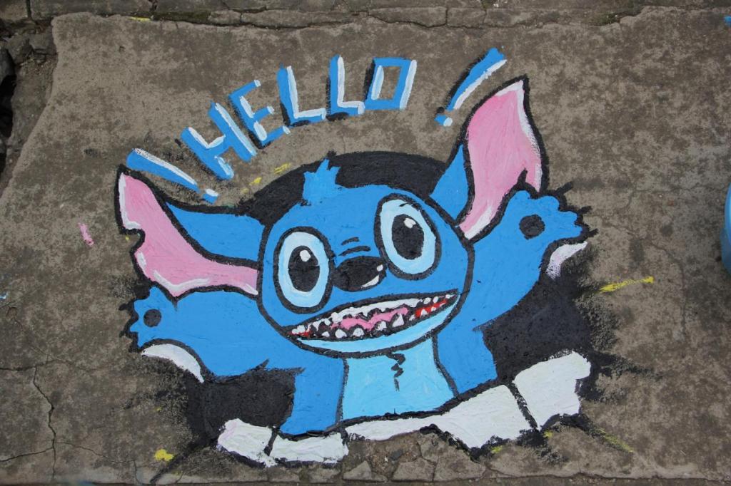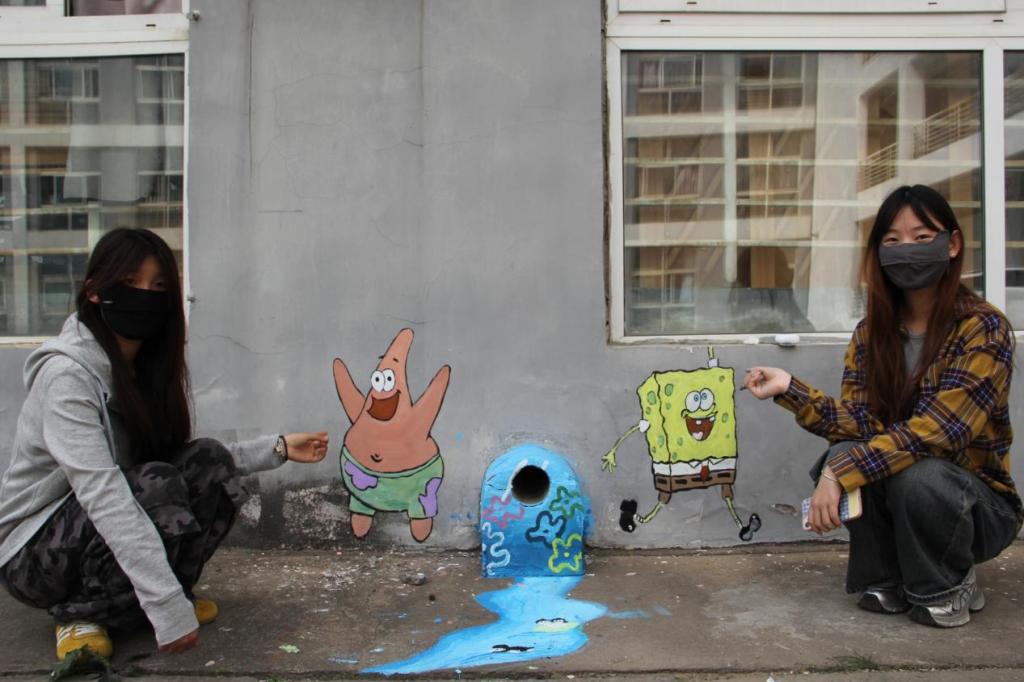 瞧!原本单调无色的地面,如今变成了一本巨型的童话绘本,学生们不畏炎炎烈日,用膝盖当画板、汗珠作调色剂,把海绵宝宝、史迪奇等各种各样的卡通图案统统“种”进了滚烫的地面。