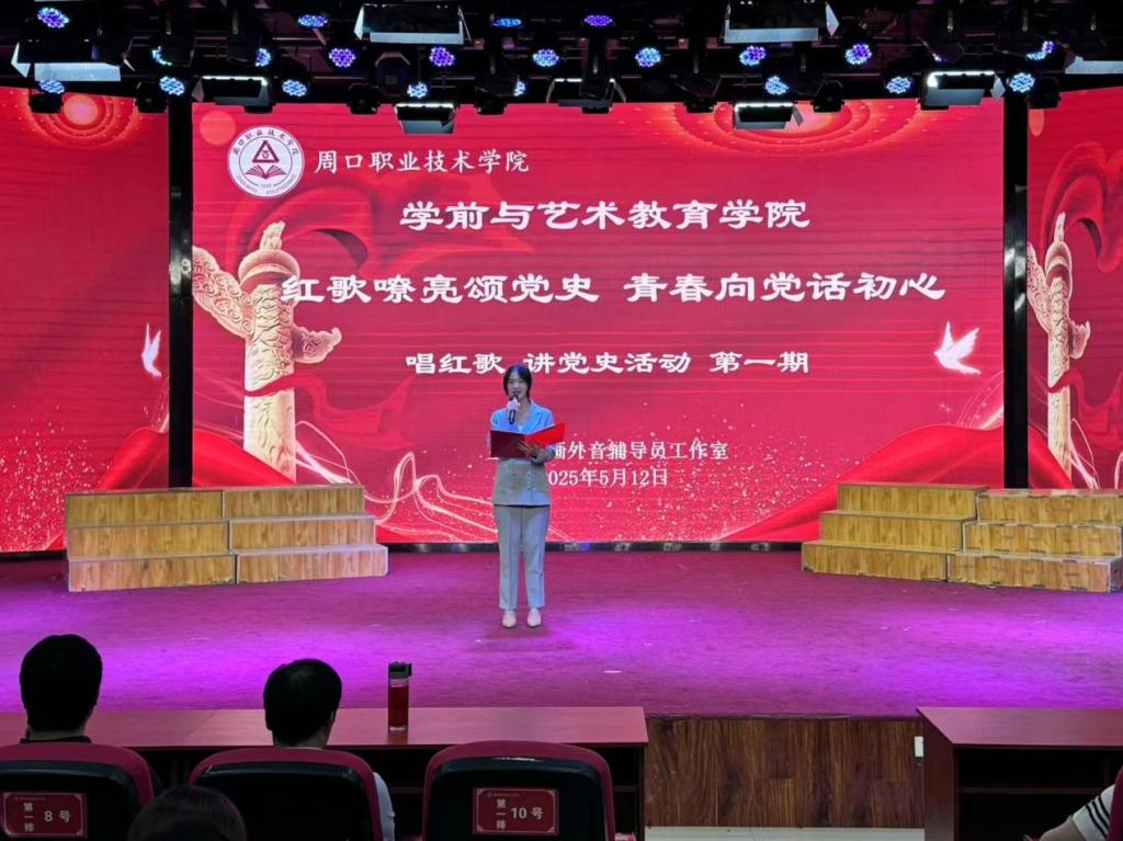 5月12日晚,由我院“画外音”辅导员工作室承办的第一期唱红歌、讲党史活动在艺术演播厅举行,学院党总支书记王春生、副院长杨晨、学管办主任郑玉凡、23、24级辅导员代表及各班班长、入党积极分子参加活动。