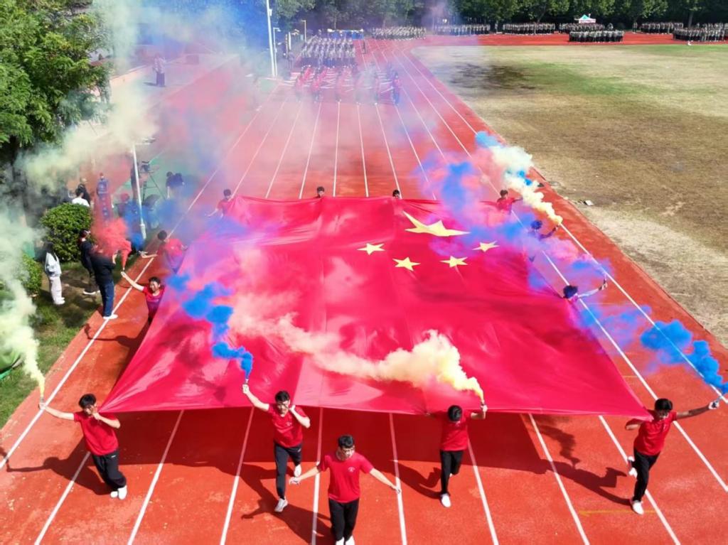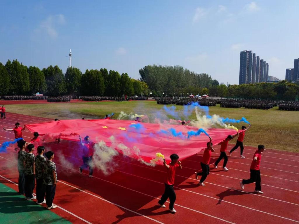 看!巨幅国旗在炫彩烟幕里震撼铺展,同学们满含朝气托举着国旗阔步走来,红绸猎猎、烟彩飞扬,炽热画面瞬间点燃全场的热血与敬意,军训成果汇报仪式就此盛大启幕。