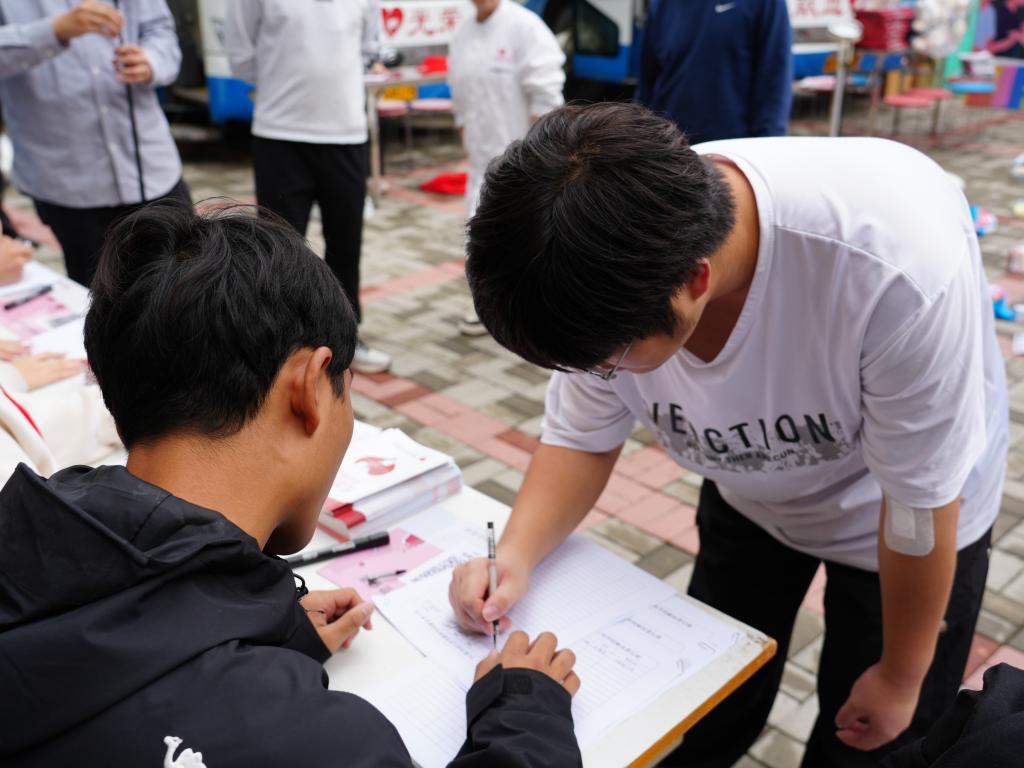 志愿者们围在桌前,仔细填写登记信息,每一笔都是对生命的敬意、对爱心的传递、对公益的郑重。随后他们在背景板上签下自己的姓名,落笔瞬间,便是热血青春应有的模样。