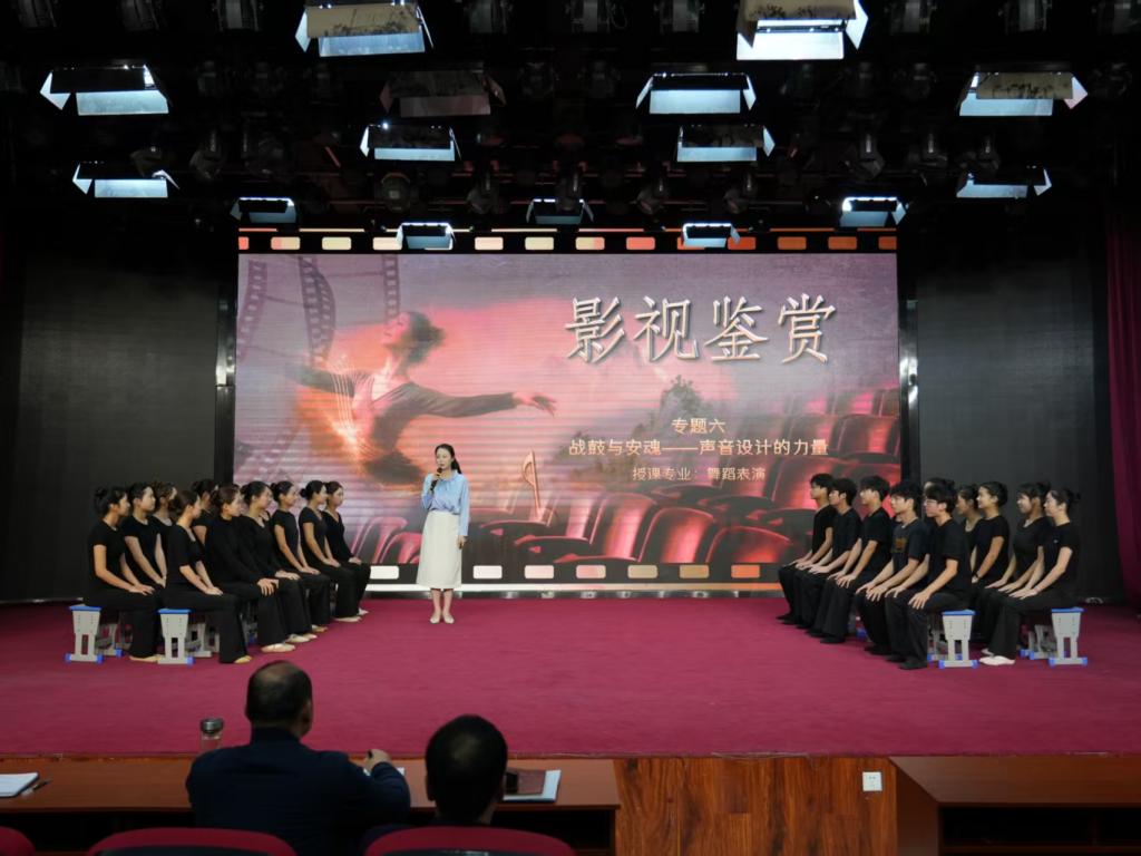 课堂教学创新大赛参赛教师张浩宇老师进行实施报告及现场教学环节展示,讲解了课程设计理念,将影视经典画面与舞蹈实践结合,引导学生感受声音设计魅力。