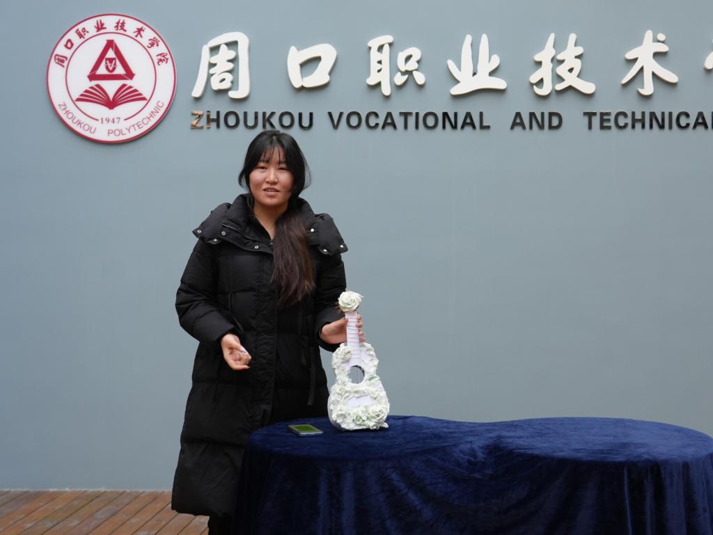 25级服装设计与工艺02班王梦晓以废旧纸箱塑形吉他基底,用卫生纸打造褶皱花艺;既保留琴身辨识度,又融合乐器线条与花艺柔美,打破艺术边界,这正是她的巧思:以浪漫艺术+手工温度,传递DIY让废旧物变美的生活美学。