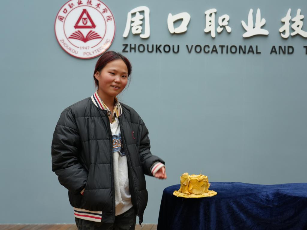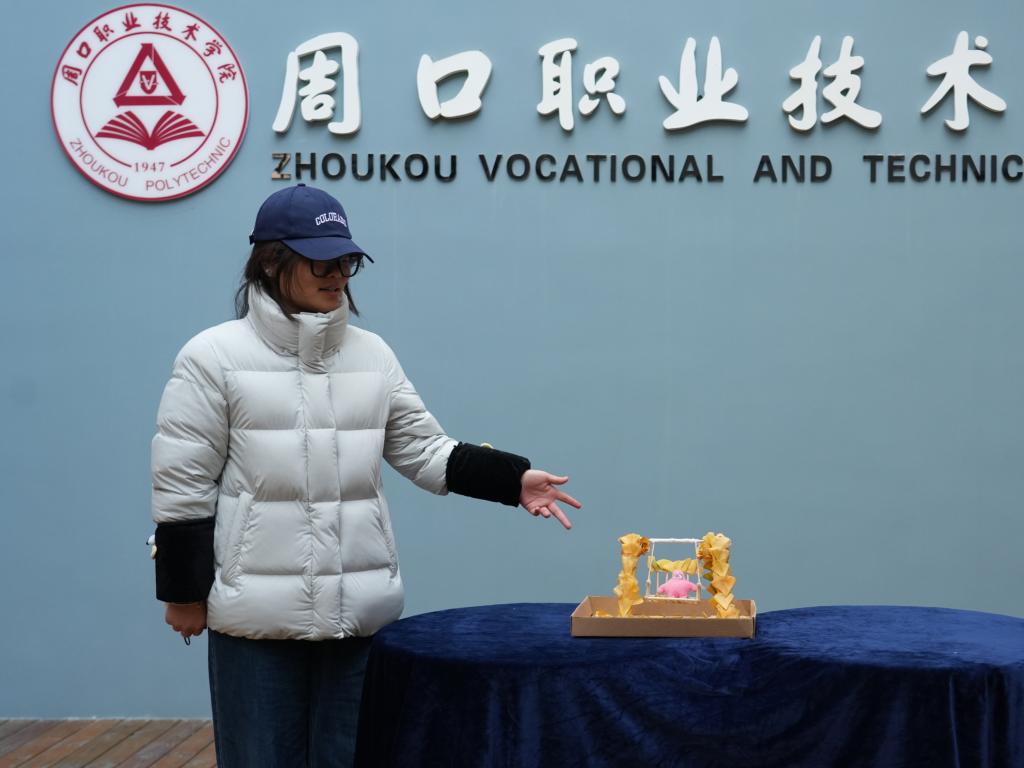 10名参赛选手们依次登台,展示参赛作品并阐述创作理念。本次参赛作品紧扣“环保、实用、创意”三大核心,主要以快递纸箱、校园枝叶及自然材料为主料,借助超轻粘土等工具,兼具日常实用功能与艺术观赏价值,尽显巧思。