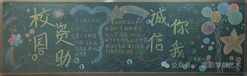 各班积极响应号召,通过绘制主题黑板报,用图文并茂的形式宣传国家资助政策,以鲜明的主题弘扬诚信受助、感恩回馈的美好理念,营造浓厚的资助育人文化氛围。接下来让我们一起欣赏同学们精心绘制的黑板报吧!