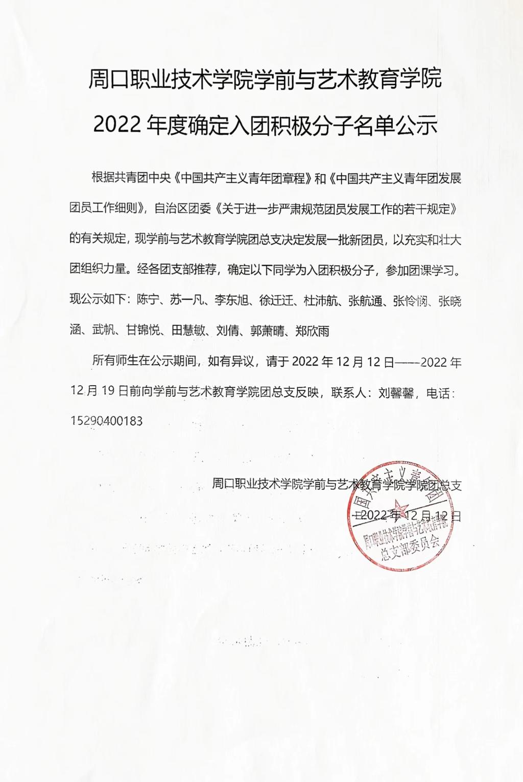 周口职业技术WilliamHill官方网站2022年团员发展对象公示