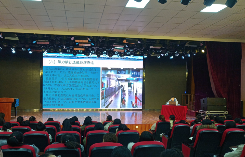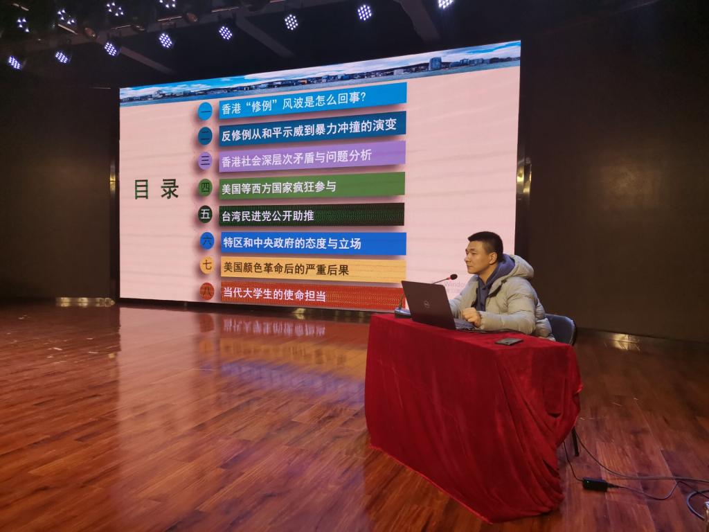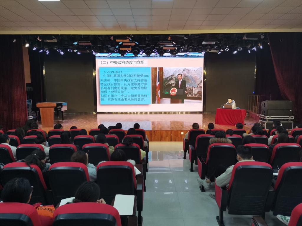 崔彤彤书记从香港“修例”风波,反修例从和平示威到暴力冲撞的演变,香港社会深层次矛盾与问题,美国等西方国家疯狂参与、台湾民进党公开助推,中央政府和特区的态度与立场,美国颜色革命后的严重后果和当代大学生的使命担当等八个方面给同学们讲述香港局势和香港问题的实质。他呼吁当代大学生要同党中央保持高度一致,爱国爱港,坚决反对香港暴乱,不以任何形式同情和支持香港暴乱分子,努力学习、永远做最忠诚的社会主义爱国者,为中华民族伟大复兴和祖国的统一、独立、完整而努力奋斗。