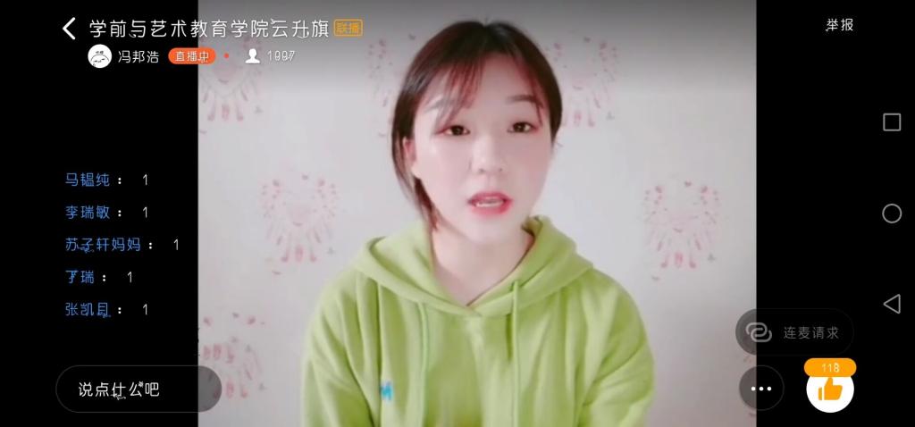 2018级学前教育五班的赵晓瑜同学作为学生代表进行发言。他在发言中提到,抗疫一线的英雄们是春天里的天使,用实际行动诠释共产党员的使命与担当,他们牺牲自己与家人相聚的时间,奋不顾身地与疫情作斗争,这种精神值得我们学习。宅在家的我们,应当继续以“停学不停课”的方式在家进行网课,以新的方式为祖国加油。