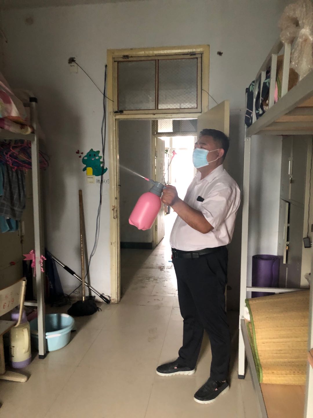 我院教师走进宿舍后,把每个宿舍开窗通风,齐心协力把布满灰尘的地面,桌子,用拖布、抹布打扫的一尘不染,不遗漏每一个宿舍,同时也对宿舍进行消毒杀菌,让“沉睡”的宿舍焕然一新。