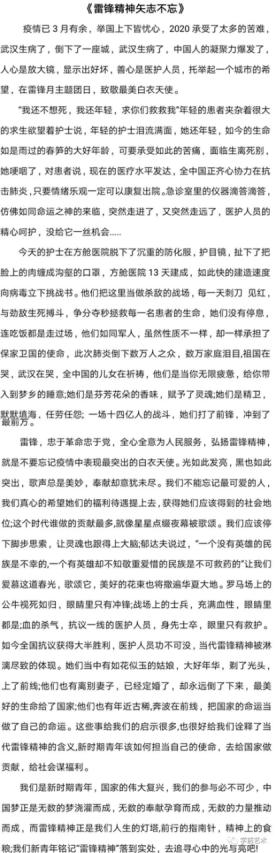 WilliamHill官方网站团总支特举办雷锋月主题团日活动——文学作品展 ,以此致敬疫情下每一位用生命保护我们的新时代的“雷锋”,每一个“您”都是英雄,谢谢“您”的坚守与付出!病毒无情,人间有情,疫情时时刻刻牵动着每一位中国人的心。我们青年学子以文章的形式书写内心对疫情当下“雷锋精神”的称赞!