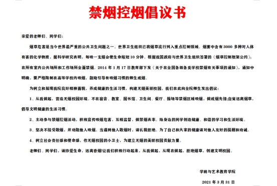 活动期间,我院团总支向全院师生发出了禁烟控烟倡议书,组织各班级开展了一次禁烟控烟主题班会。班会上,通过对禁烟知识的讲解,让同学们进一步认识到吸烟的危害。同学们宣读禁烟誓词,表达了创建无烟环境,共建文明校园的决心。