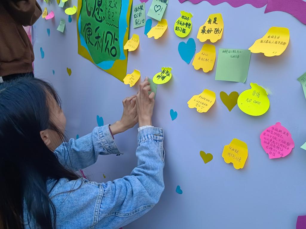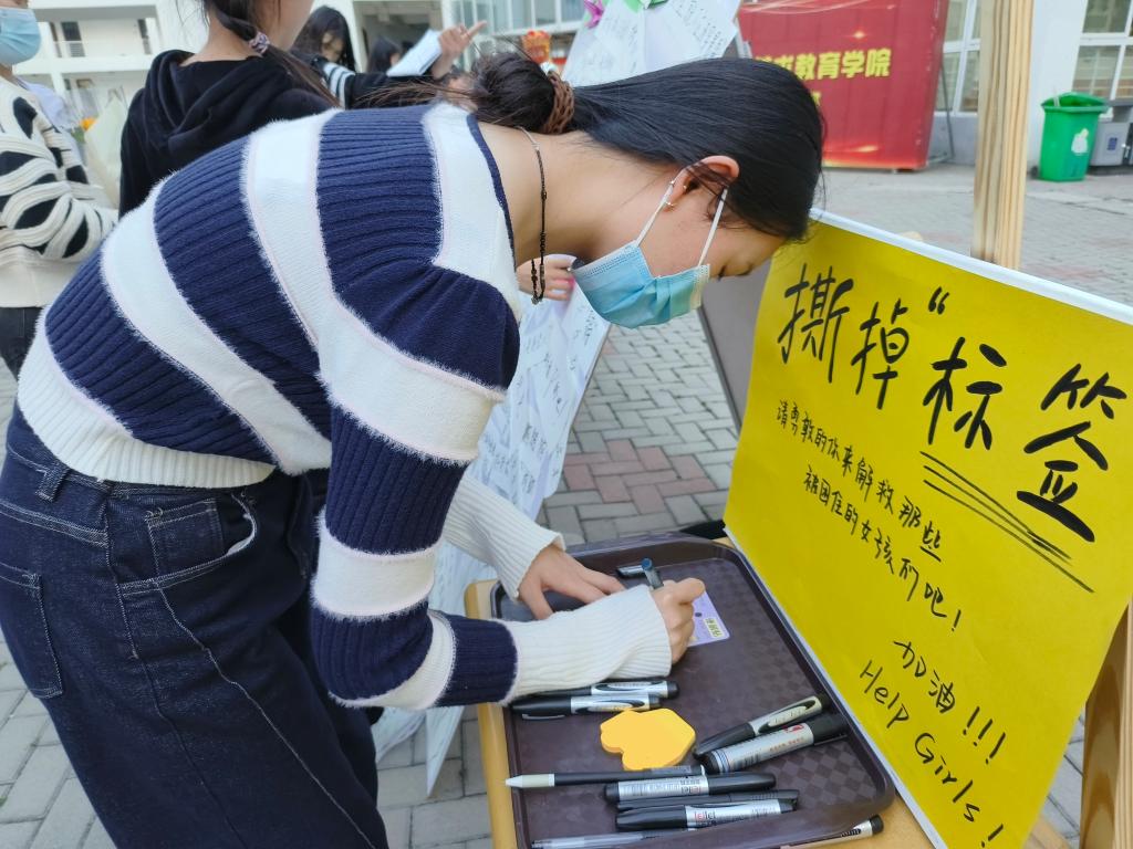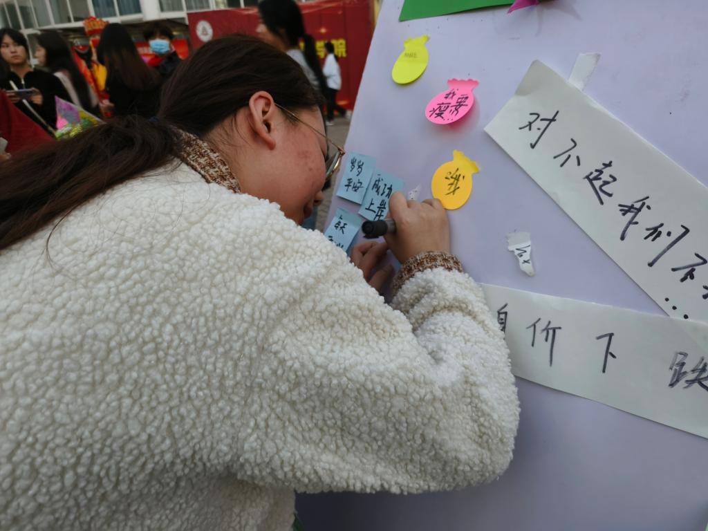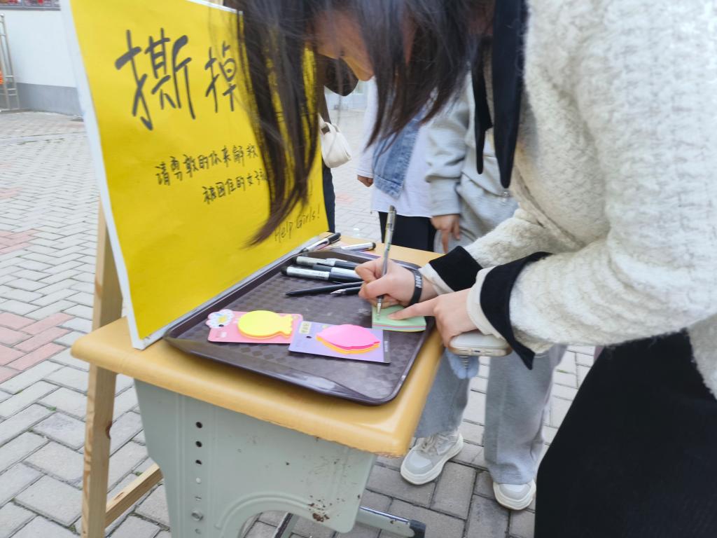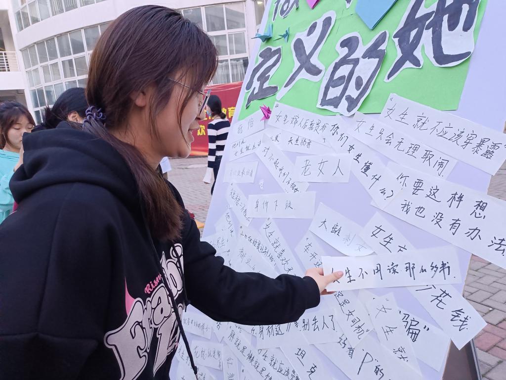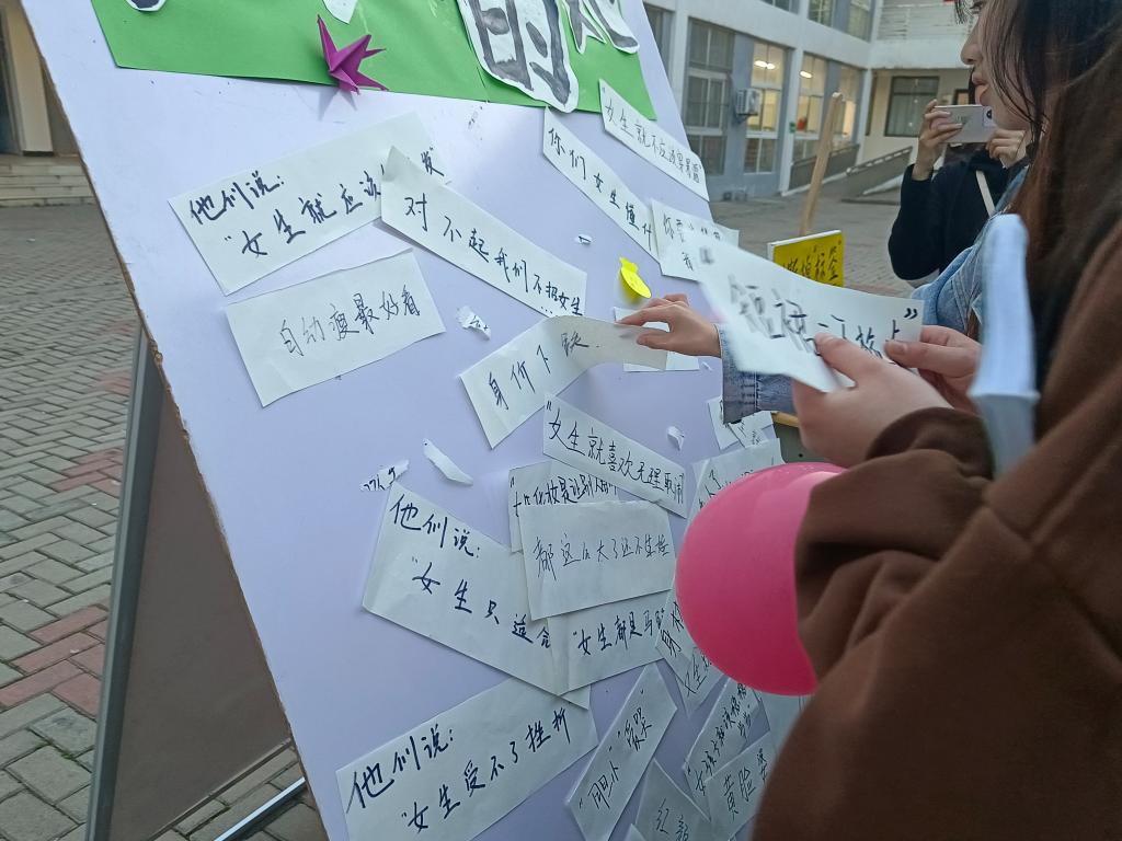 撕掉标签,不被束缚。借助便利贴,写下同学们对自我价值的追求及对亲人、朋友、老师的祝愿,同时赠予女生一个带有暖心文案的气球,学院男生也通过唱歌的方式表达对女生的赞美,激励着女大学生超越自己,突破自我,勇敢做自己!