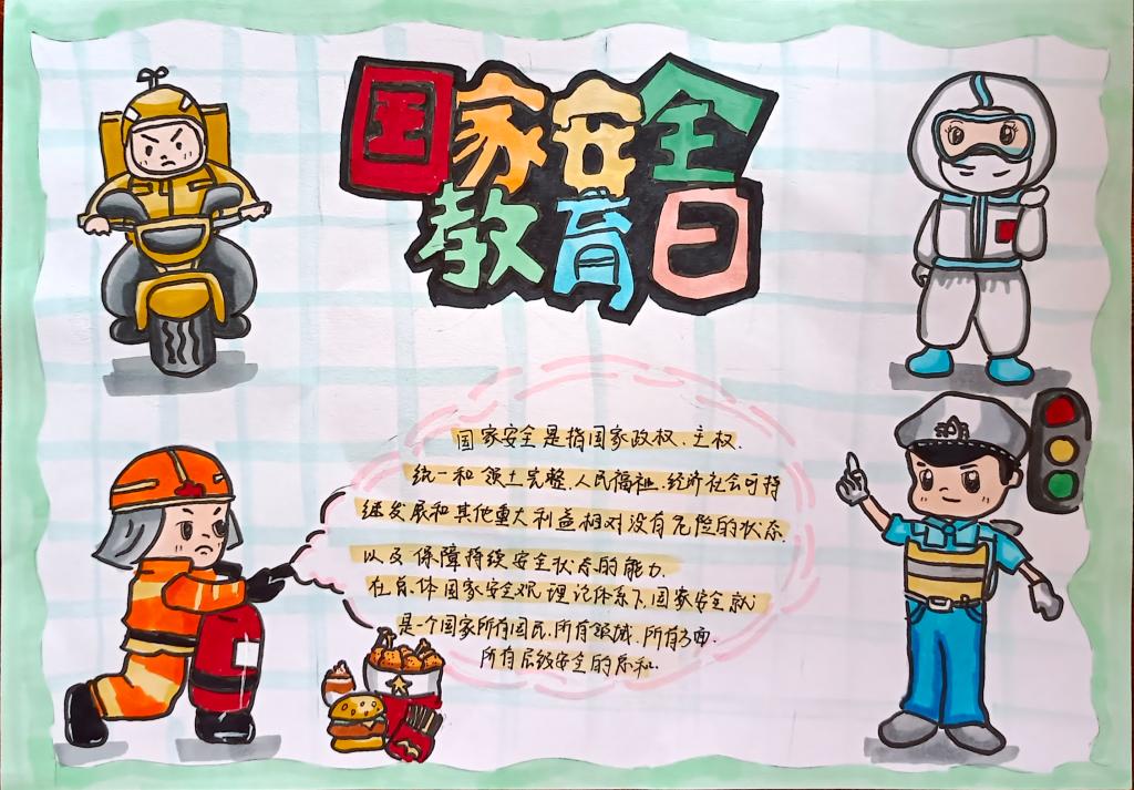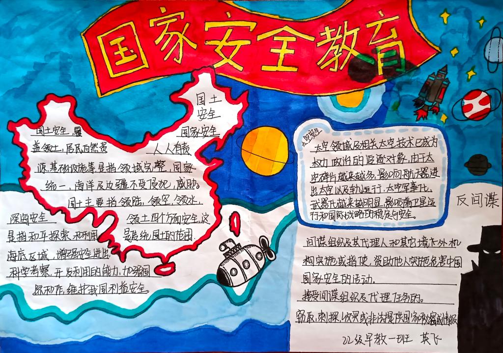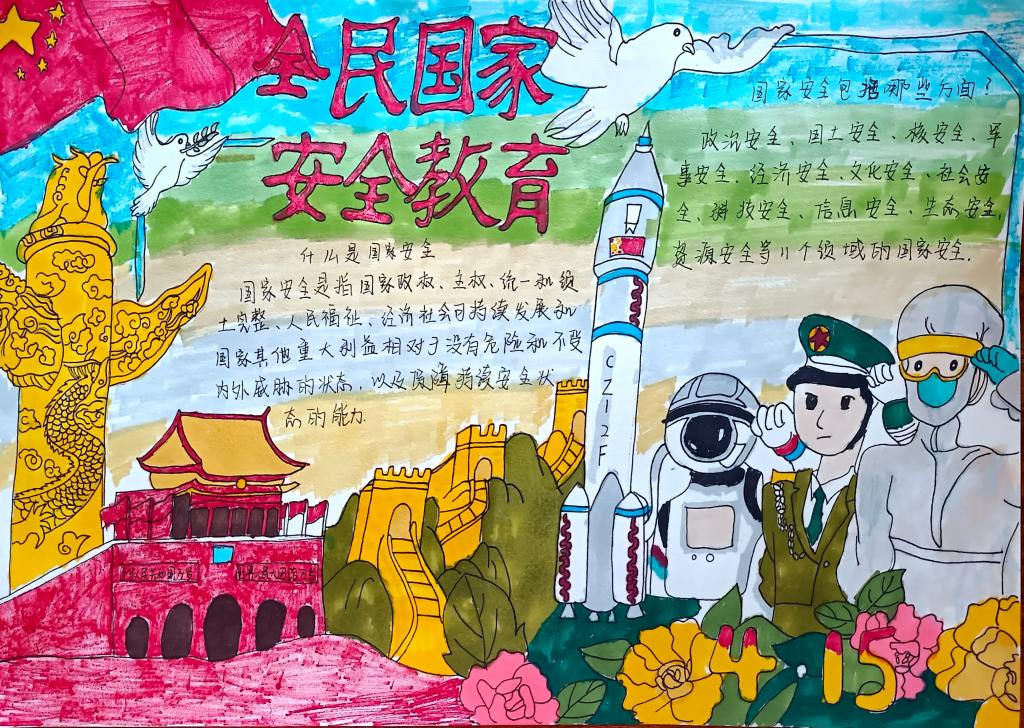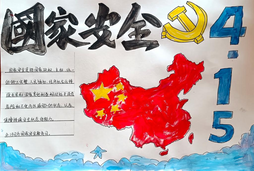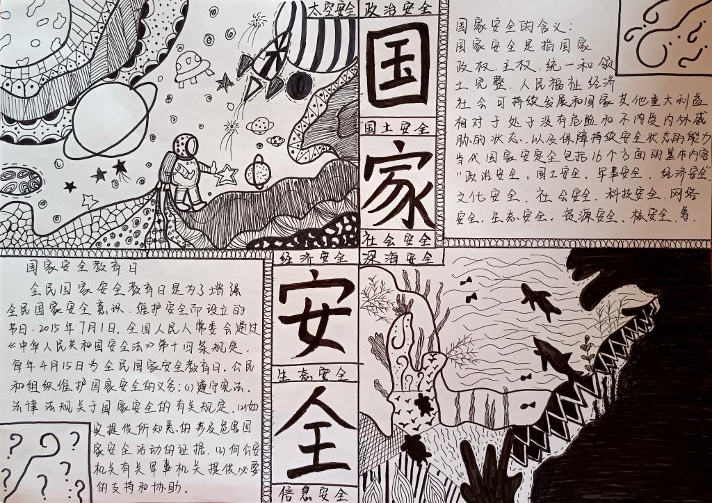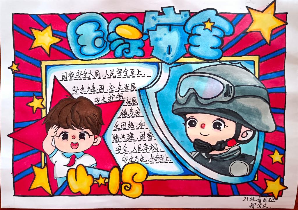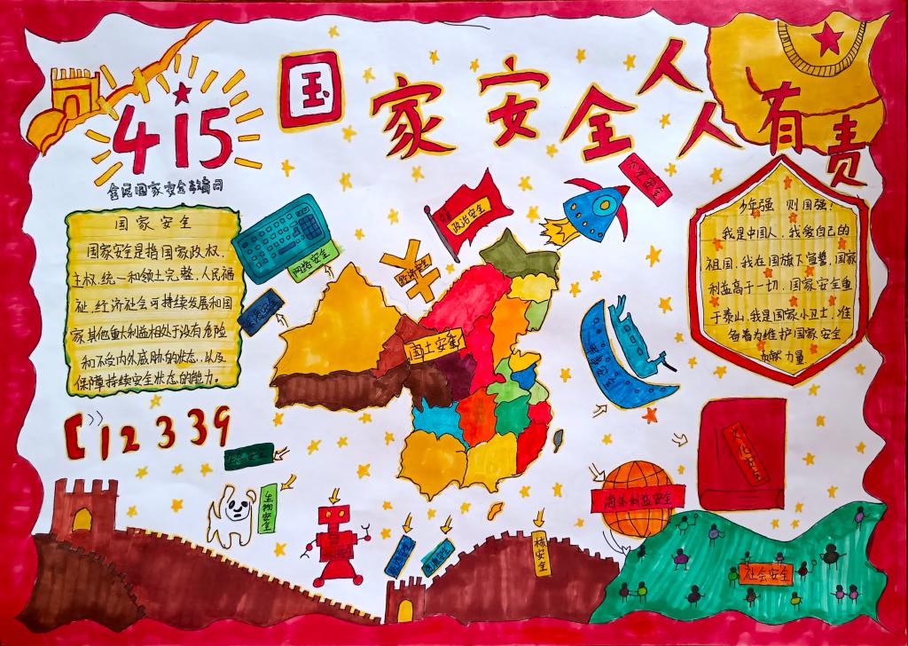 同学们以国家安全教育为主题,通过寻找相关资料,经过巧妙的构思布局、精心的设计,运用丰富的色彩,充分发挥自己的想象力和创造力,将国家安全的相关知识用文字和图画的形式表现了出来。