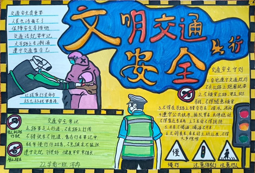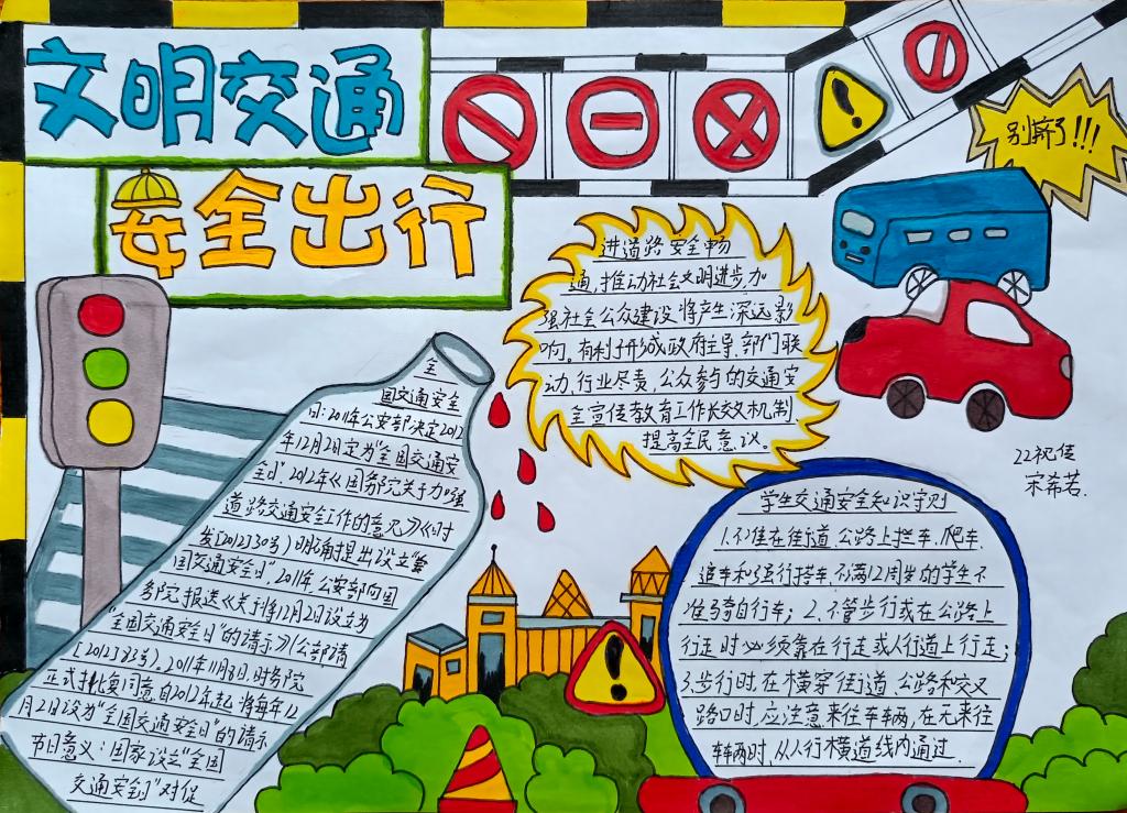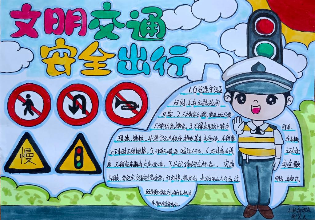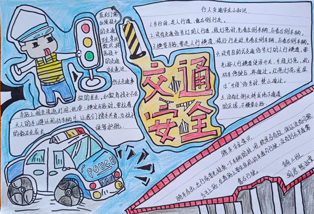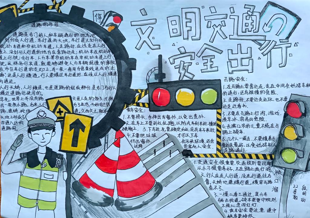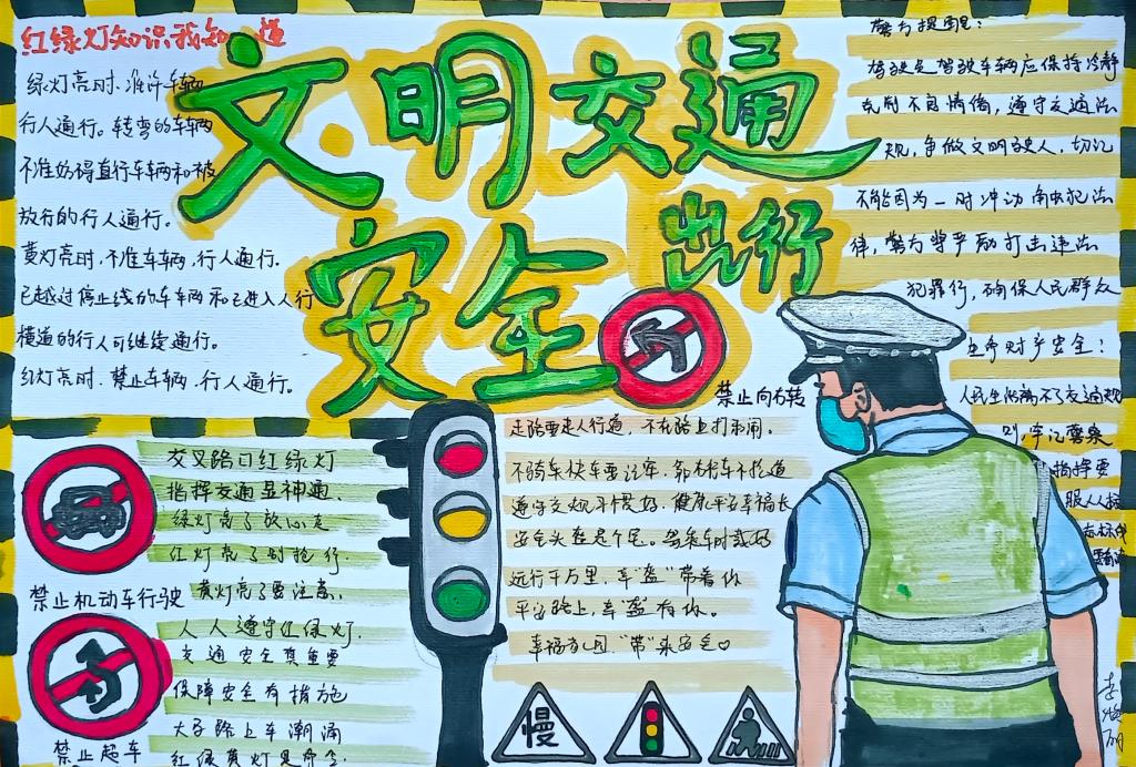 同学们在认真学习了《倡议书》后,精心设计绘制出一幅幅图文并茂、内容丰富的手抄报作品,表示交通安全知识会牢记于心,在出行中严格遵守交通规则,确保自身安全,争做文明交通的践行者和示范者。