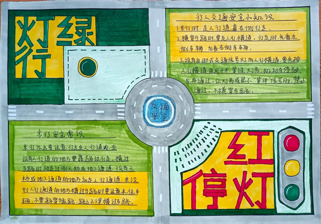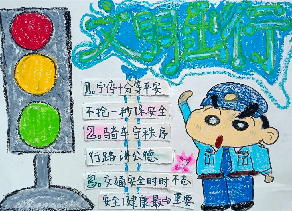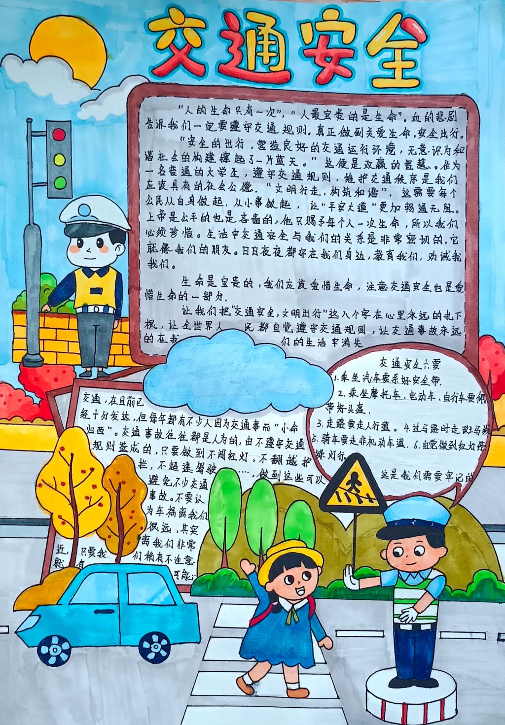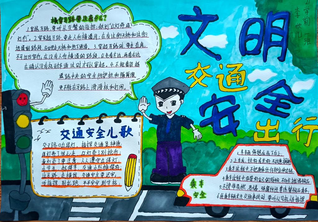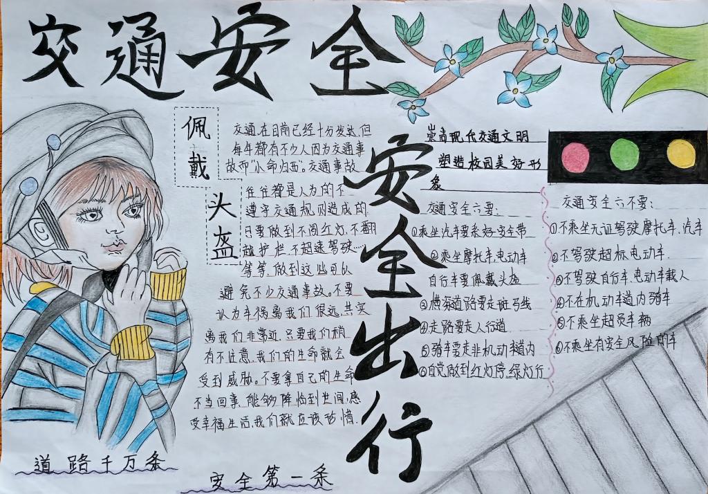 同学们在认真学习了《倡议书》后,精心设计绘制出一幅幅图文并茂、内容丰富的手抄报作品,表示交通安全知识会牢记于心,在出行中严格遵守交通规则,确保自身安全,争做文明交通的践行者和示范者。