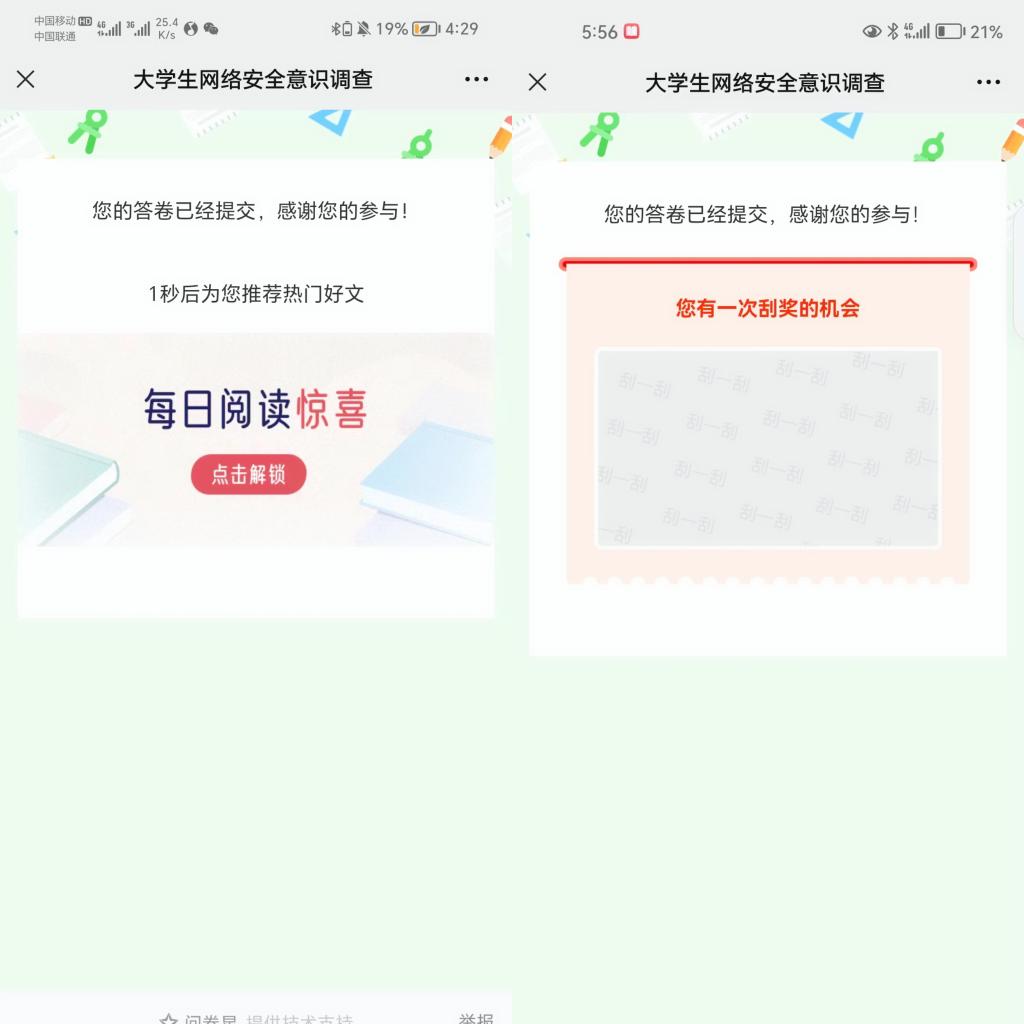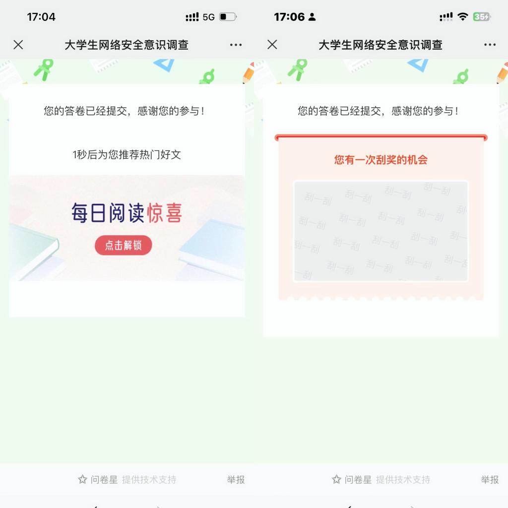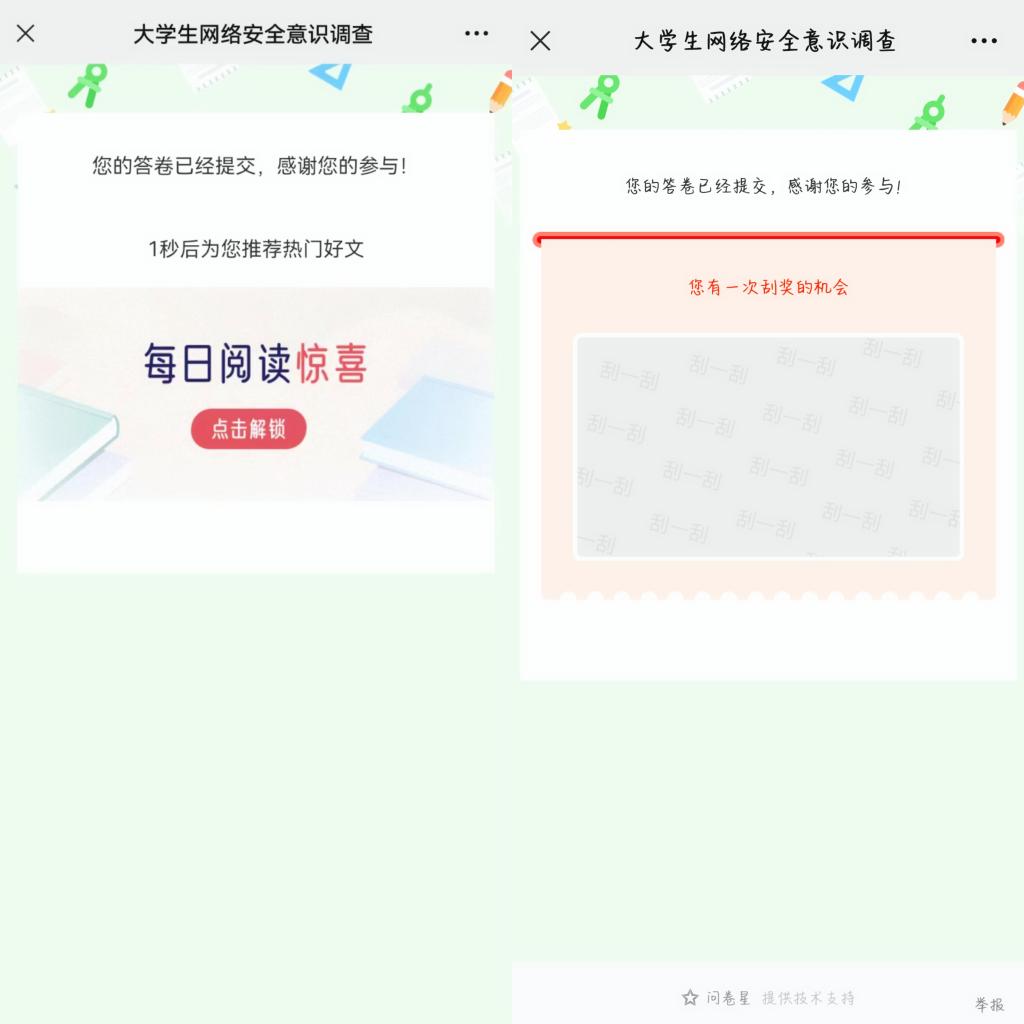 活动中,同学们积极配合,通过扫描调查问卷的二维码进入问卷小程序,认真作答。问卷题目设置灵活多样,内容丰富,同学们在填写过程中,认识到了自己网络安全防范意识存在不足,敲响了心中防范网络安全的警钟。
