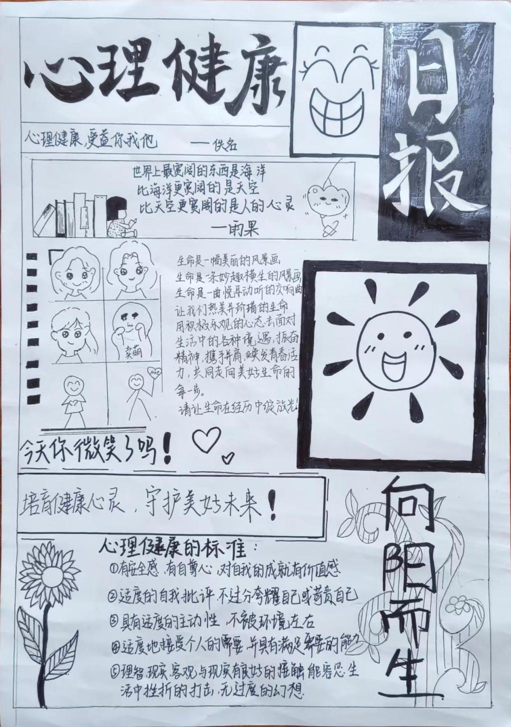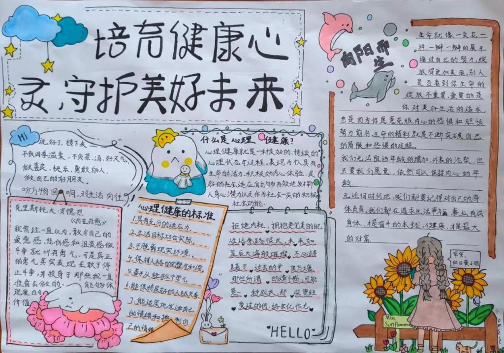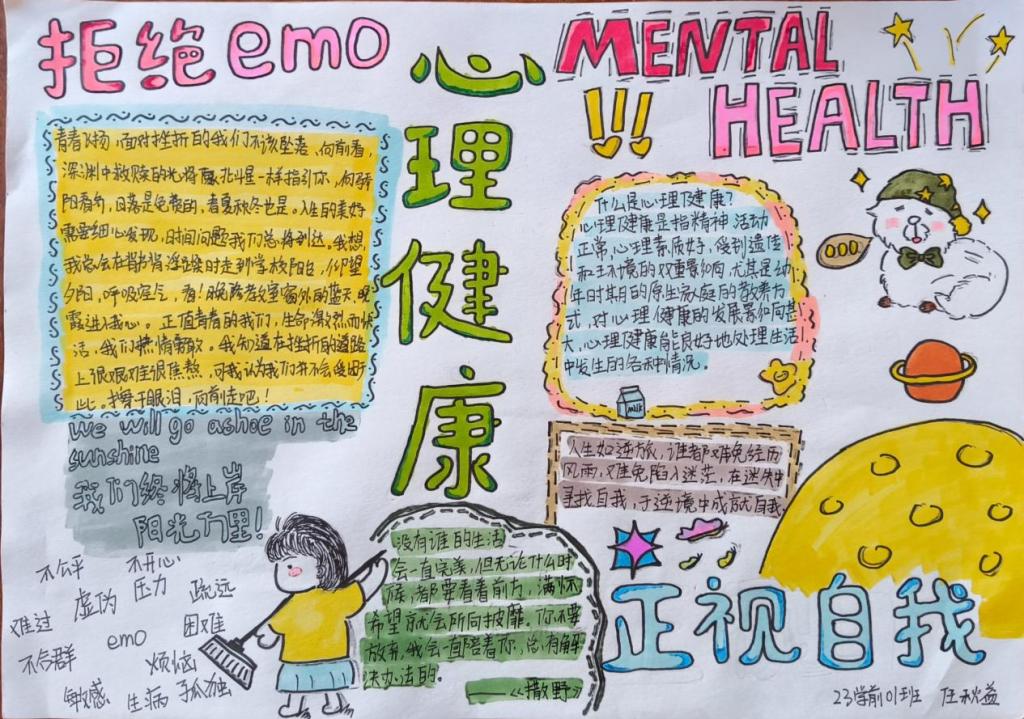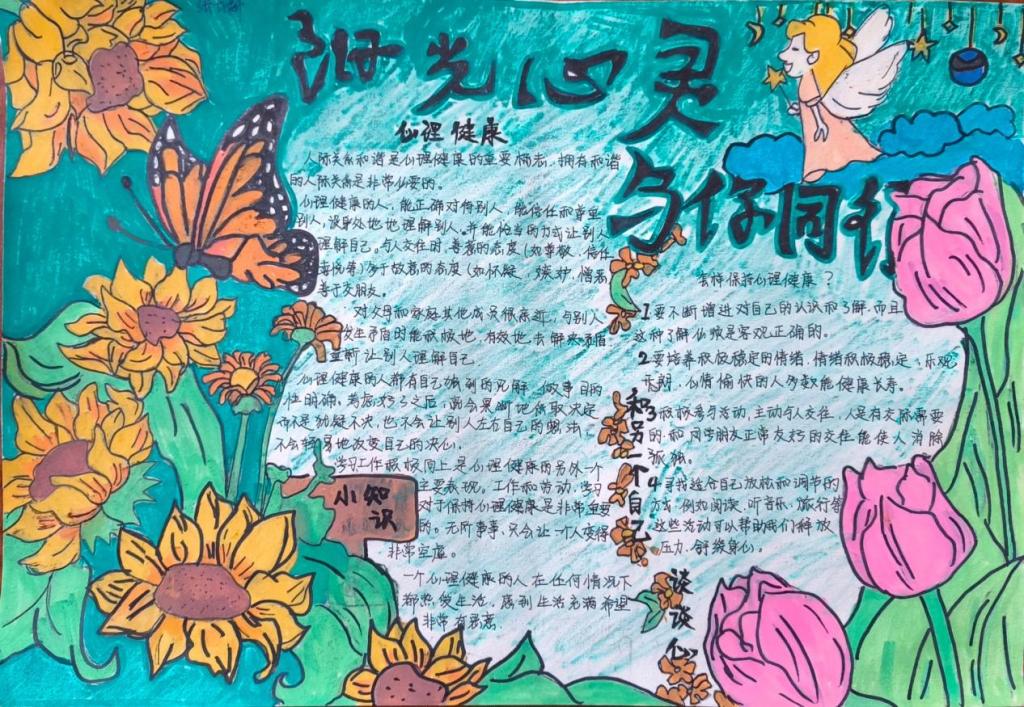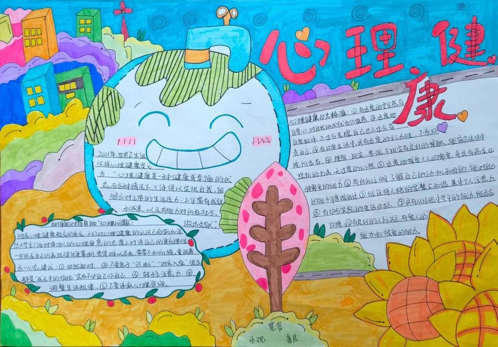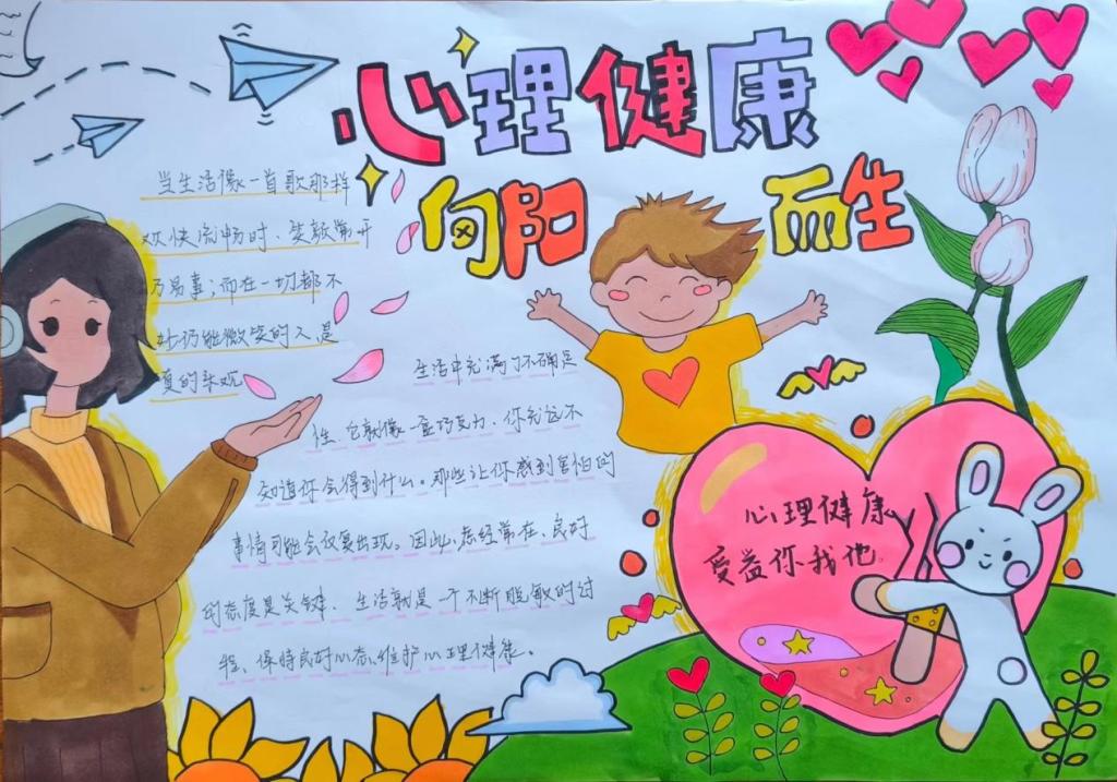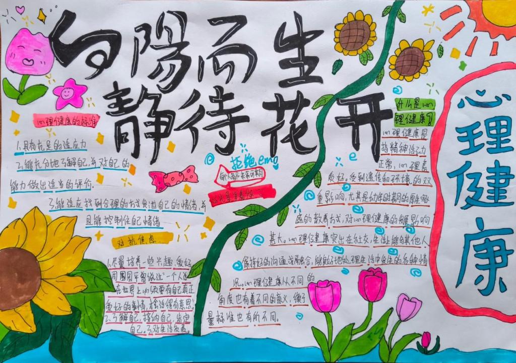 同学们根据活动主题,认真思考,发挥特长,用五彩斑斓的画笔描绘出自己对心理健康知识的理解,传递了有关心理健康的知识。一幅幅图文并茂、内涵丰富的手抄报,多角度展示了同学们的心灵世界。