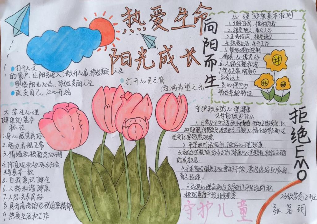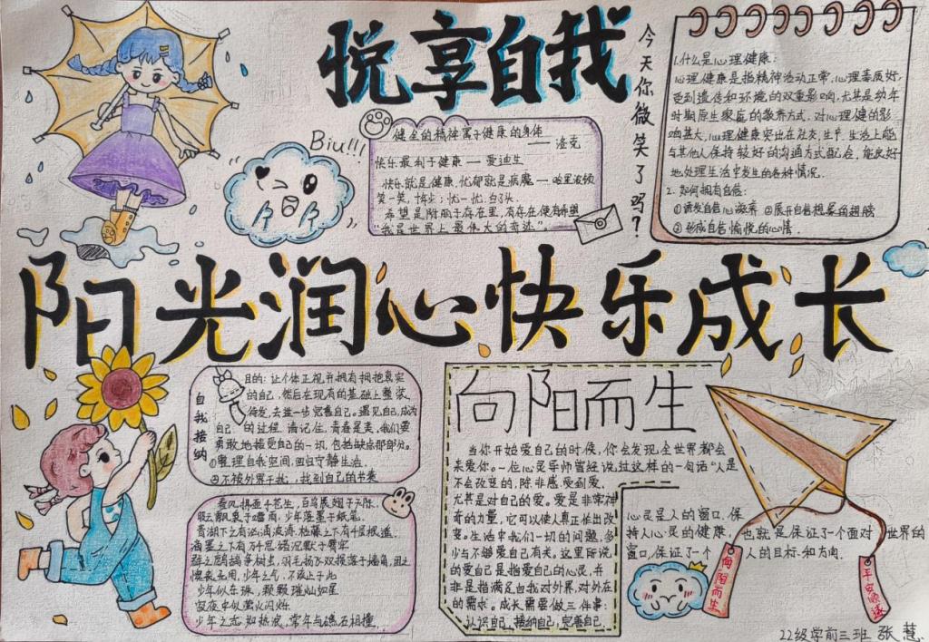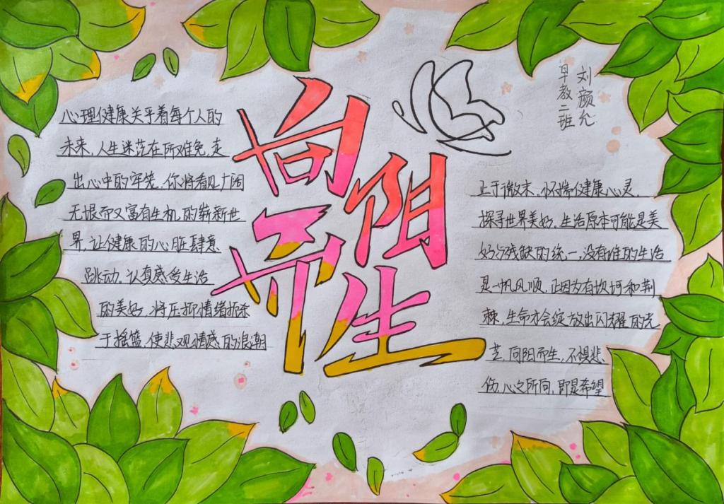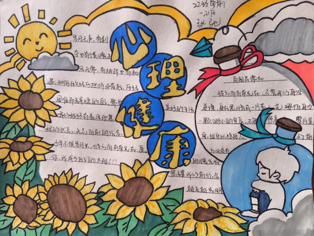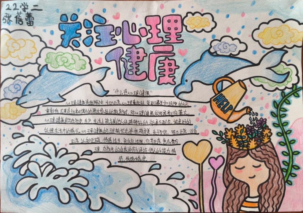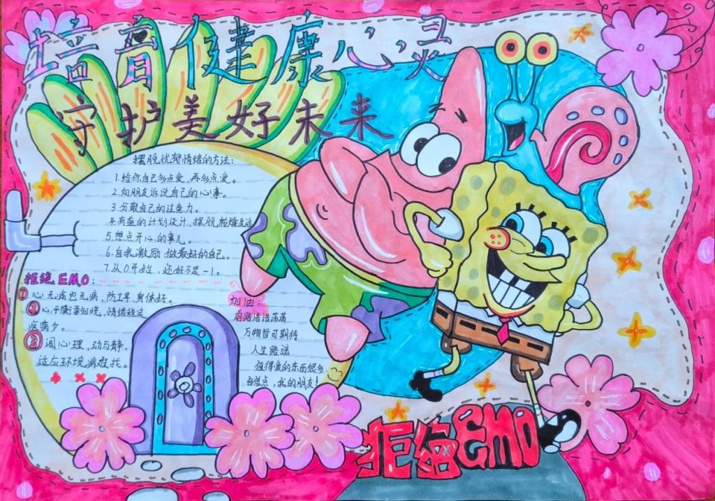 同学们根据活动主题,认真思考,发挥特长,用五彩斑斓的画笔描绘出自己对心理健康知识的理解,传递了有关心理健康的知识。一幅幅图文并茂、内涵丰富的手抄报,多角度展示了同学们的心灵世界。